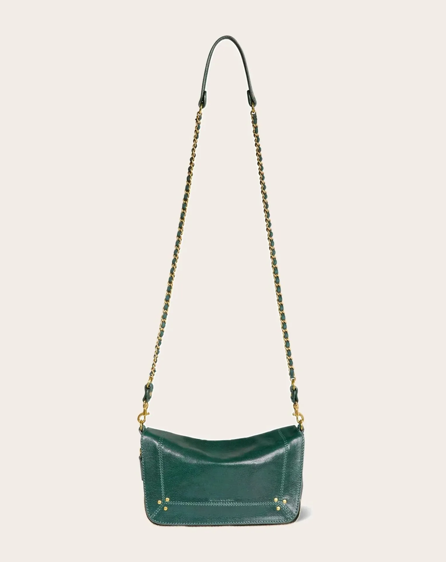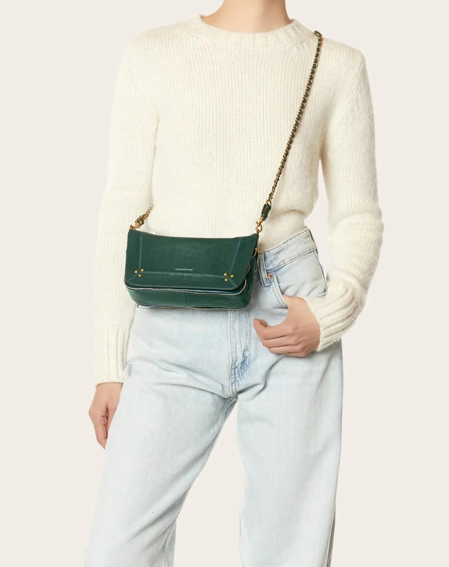 - Sac bandoulière, porté à l’épaule ou en croisé. Bandoulière amovible en chaîne tressée de cuir. Fermeture par un rabat en cuir aimanté.