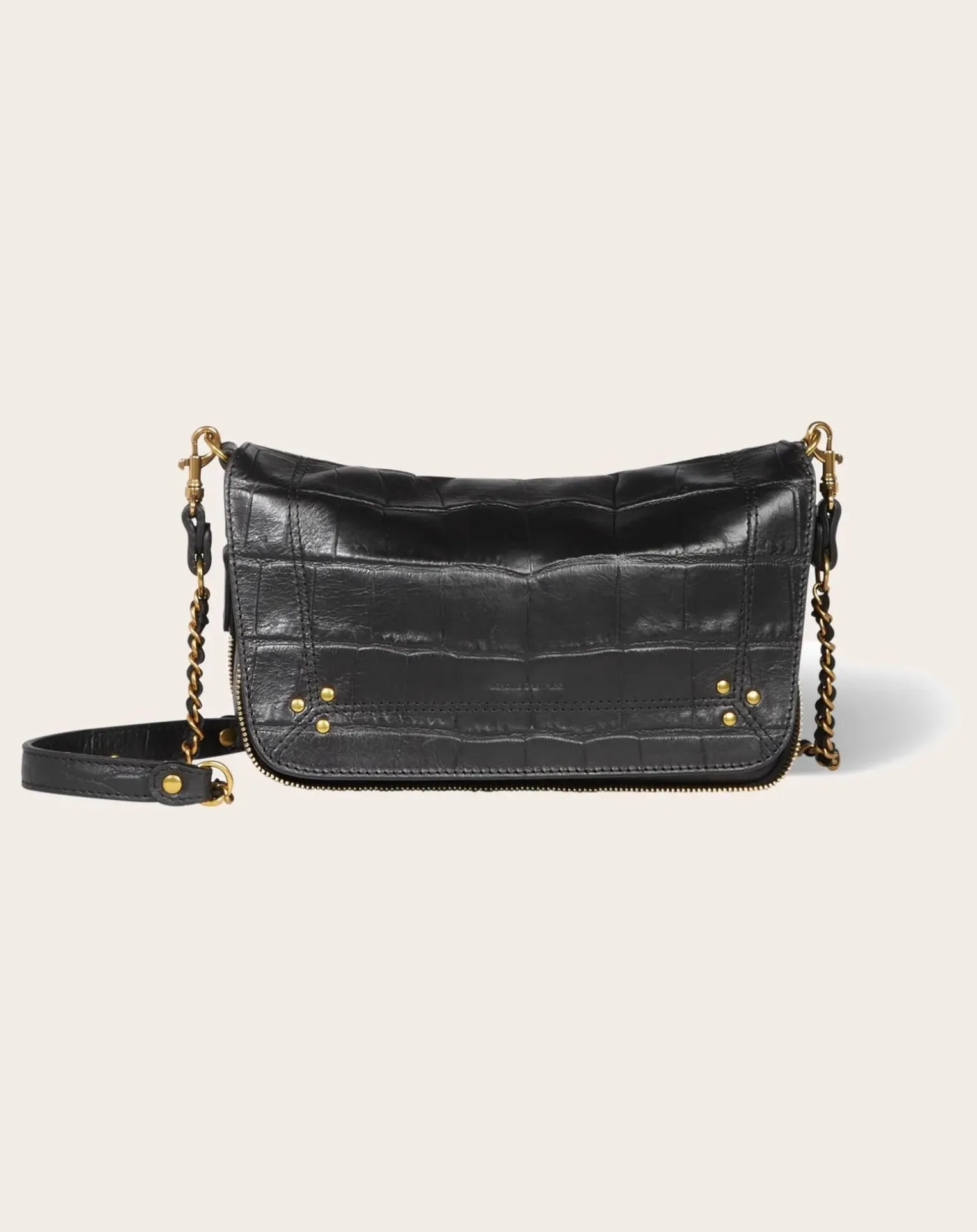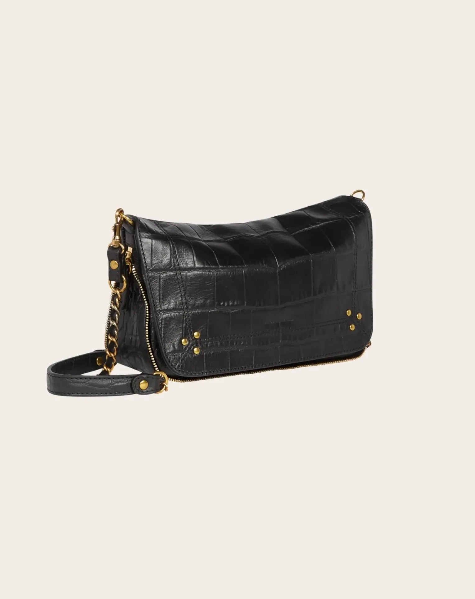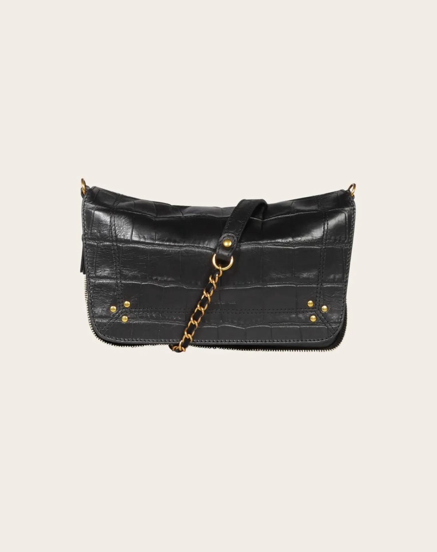 - Sac bandoulière, porté à l’épaule ou en croisé. Bandoulière amovible en chaîne tressée de cuir. Fermeture par un rabat en cuir aimanté.