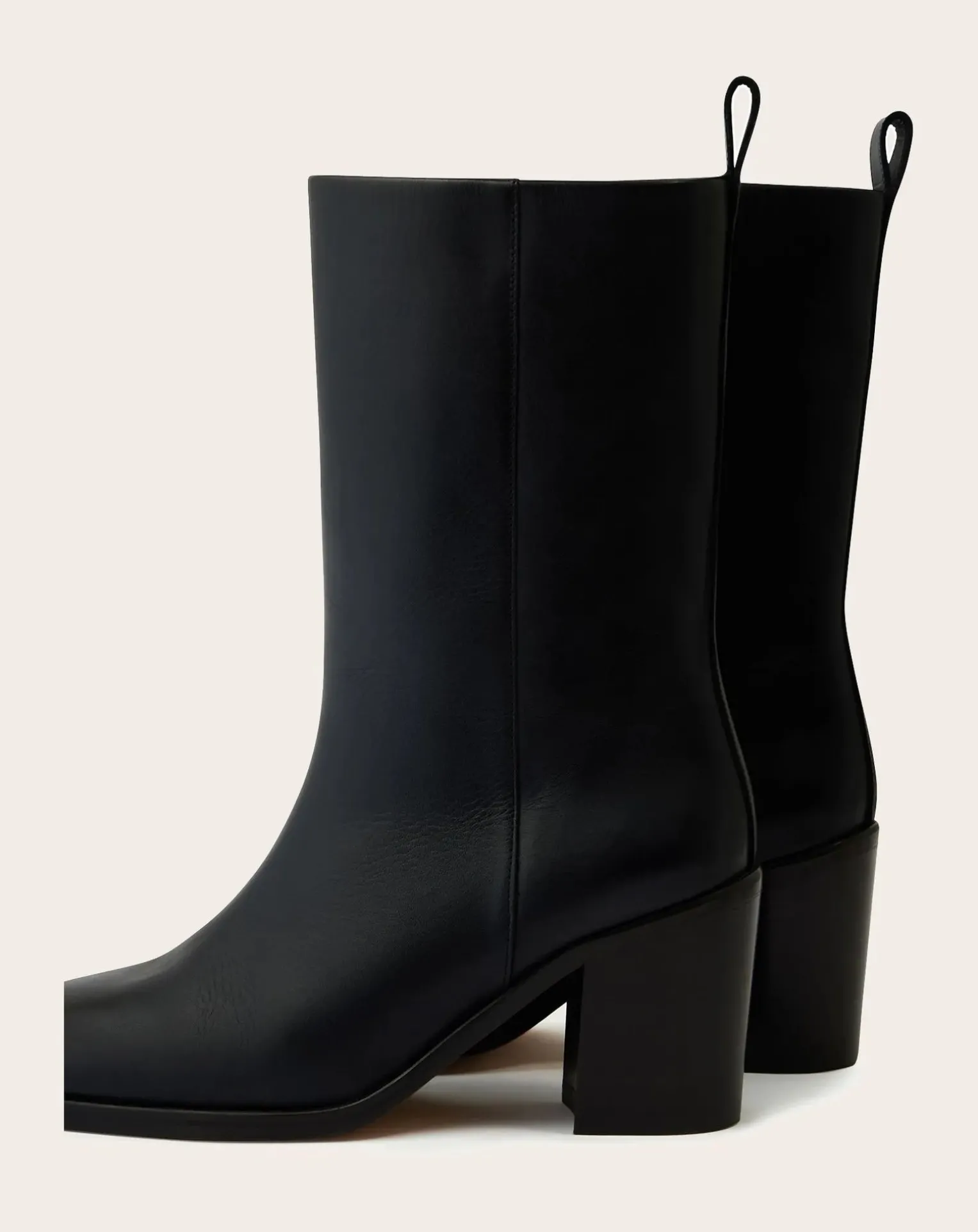 - – Bottes à talon en cuir noir – Bottes à talon large en cuir – Bout arrondi- Fermeture par un zip sur le coté interne de la botte- Hauteur de tige 21cm- Hauteur talon 8cm- Passant talon pour enfiler la botte – Cuir LWG