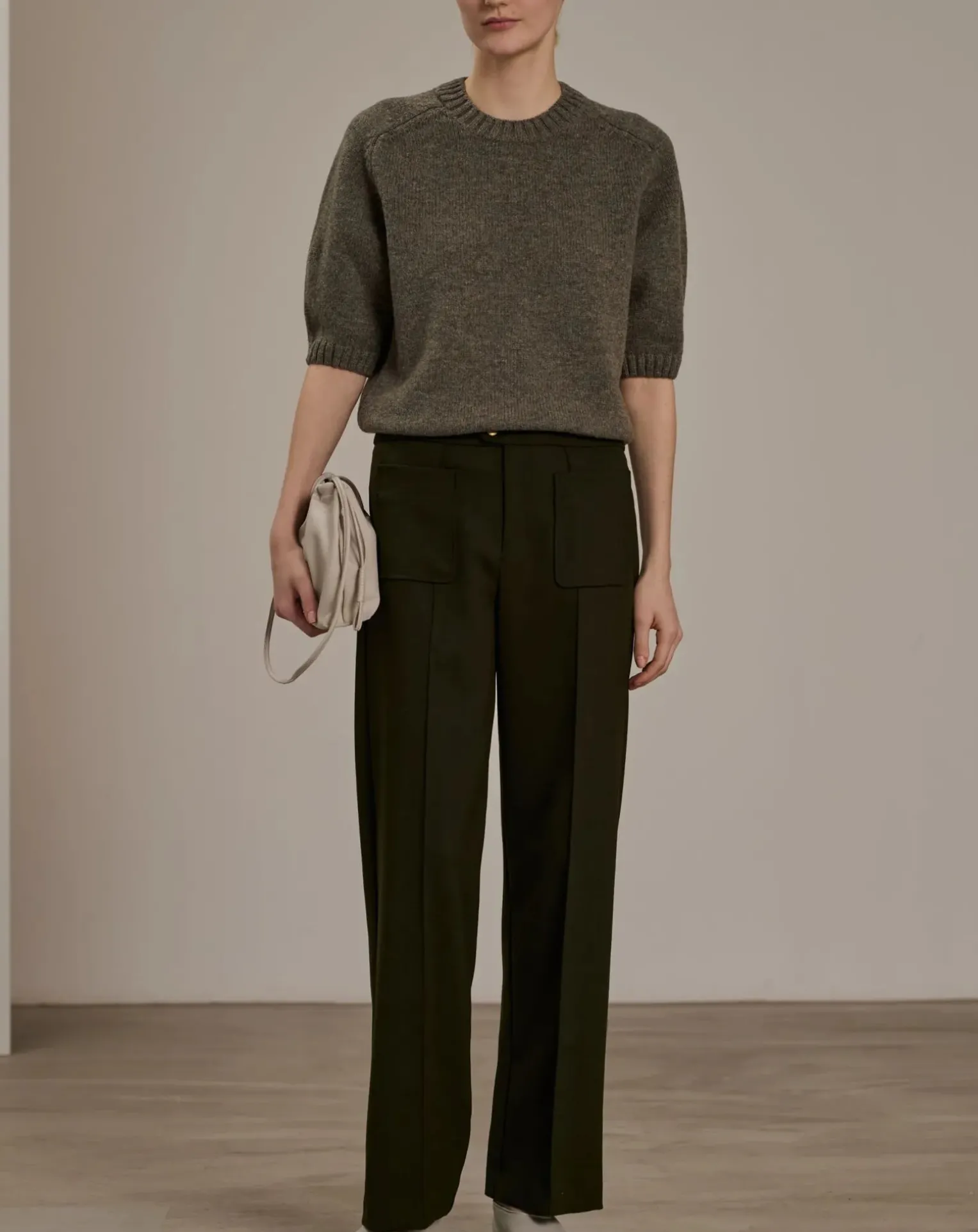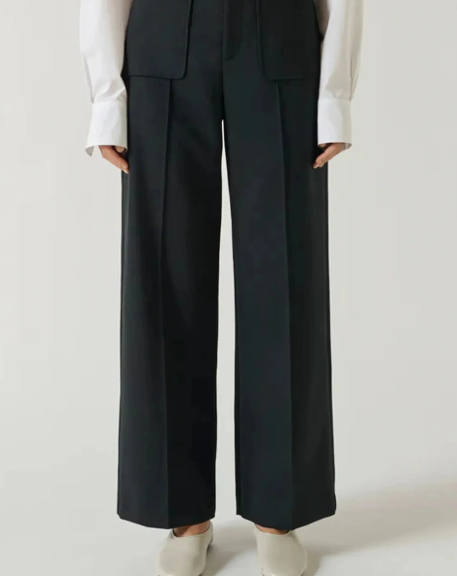 - Pantalon en lainage technique noir- Coupe droite légèrement évasée- Deux poches plaquées devant et dos- Pli marqué le long de la jambe