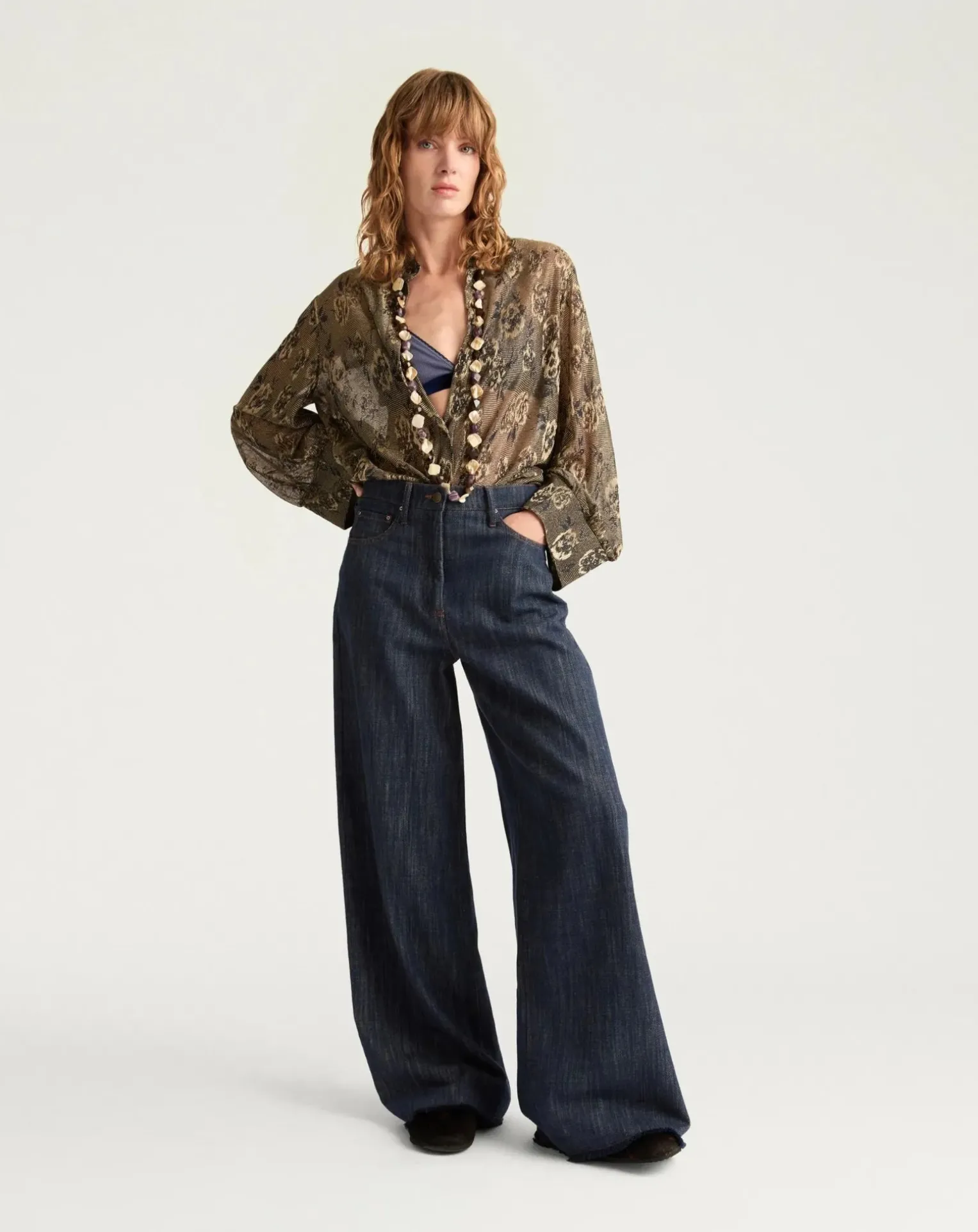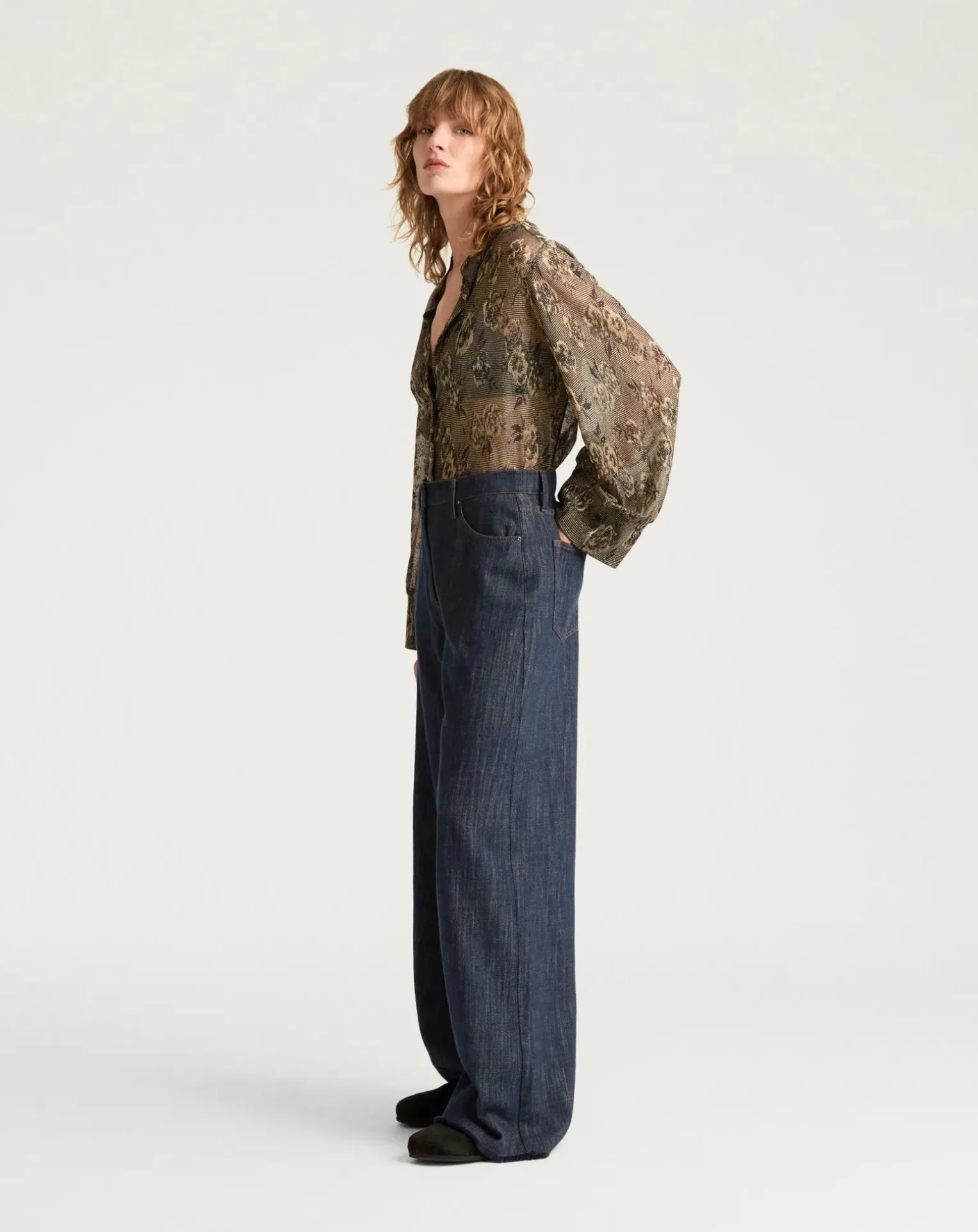 - Pantalon 5 poches en denim teinté fil. Jambe longue et droite, sangle construite, passante en M à l’arrière avec des poutres contrastées, ouverture avec bouton-clou logé, rivets et zip.