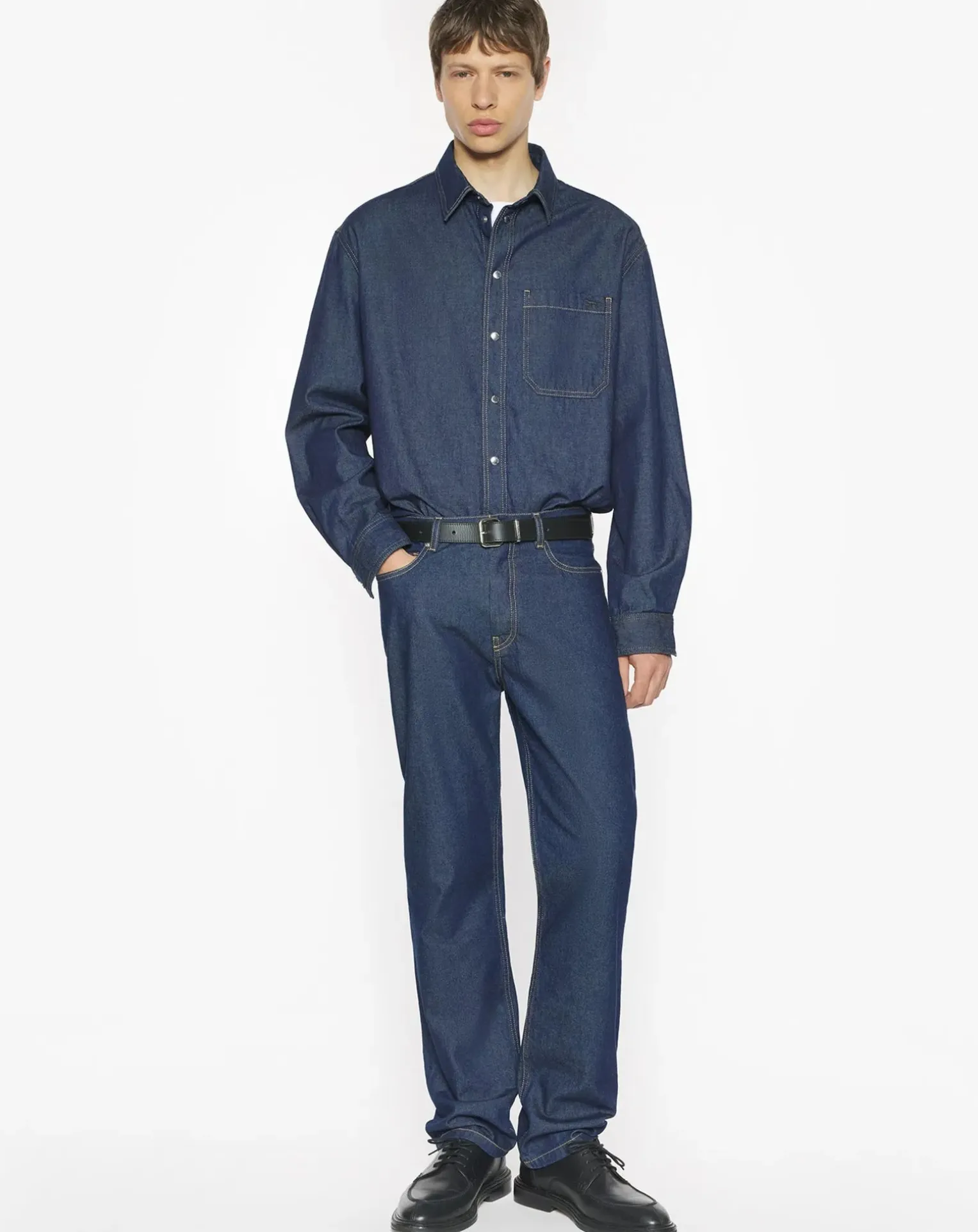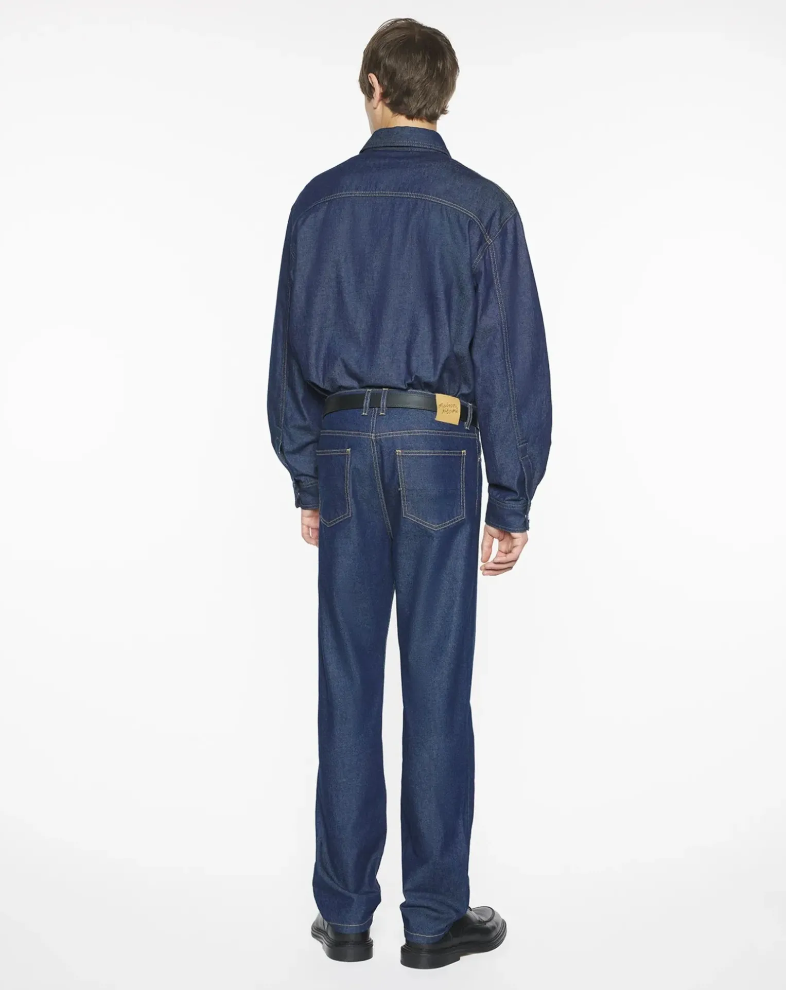 - Pantalon à ceinture montée avec passants, fermeture boutonnée en métal gravé Maison Kitsuné et braguette boutonnée sous patte, cinq poches, et jacron en cuir embossé de la signature Maison Kitsuné Handwriting au dos.