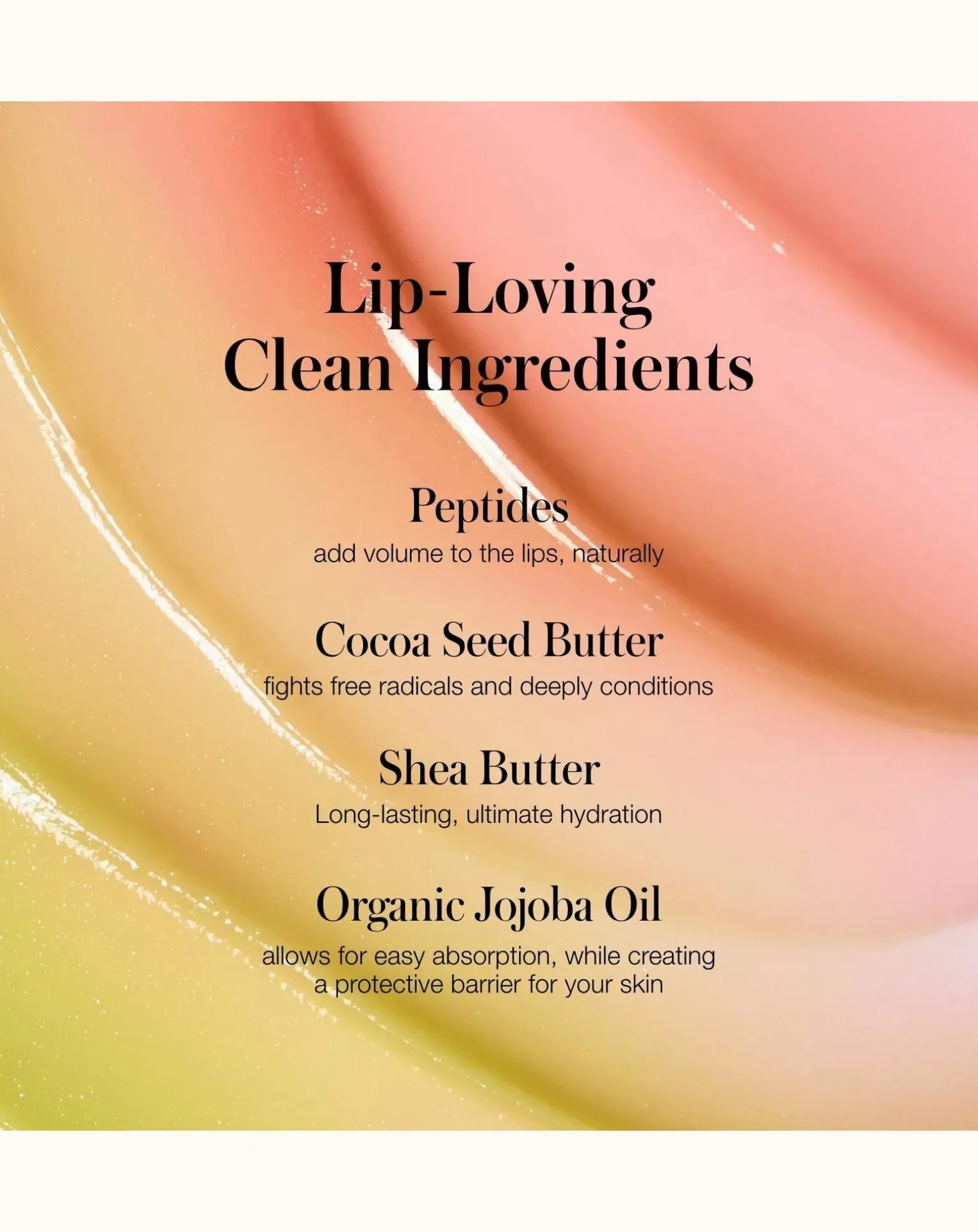 Peptides : Ajoute un volume subtil aux lèvres, naturellement. Beurre de graines de cacao : Riche en antioxydants et en acides gras, le beurre de cacao est un hydratant naturel et nourrissant qui combat les radicaux libres et soigne en profondeur.