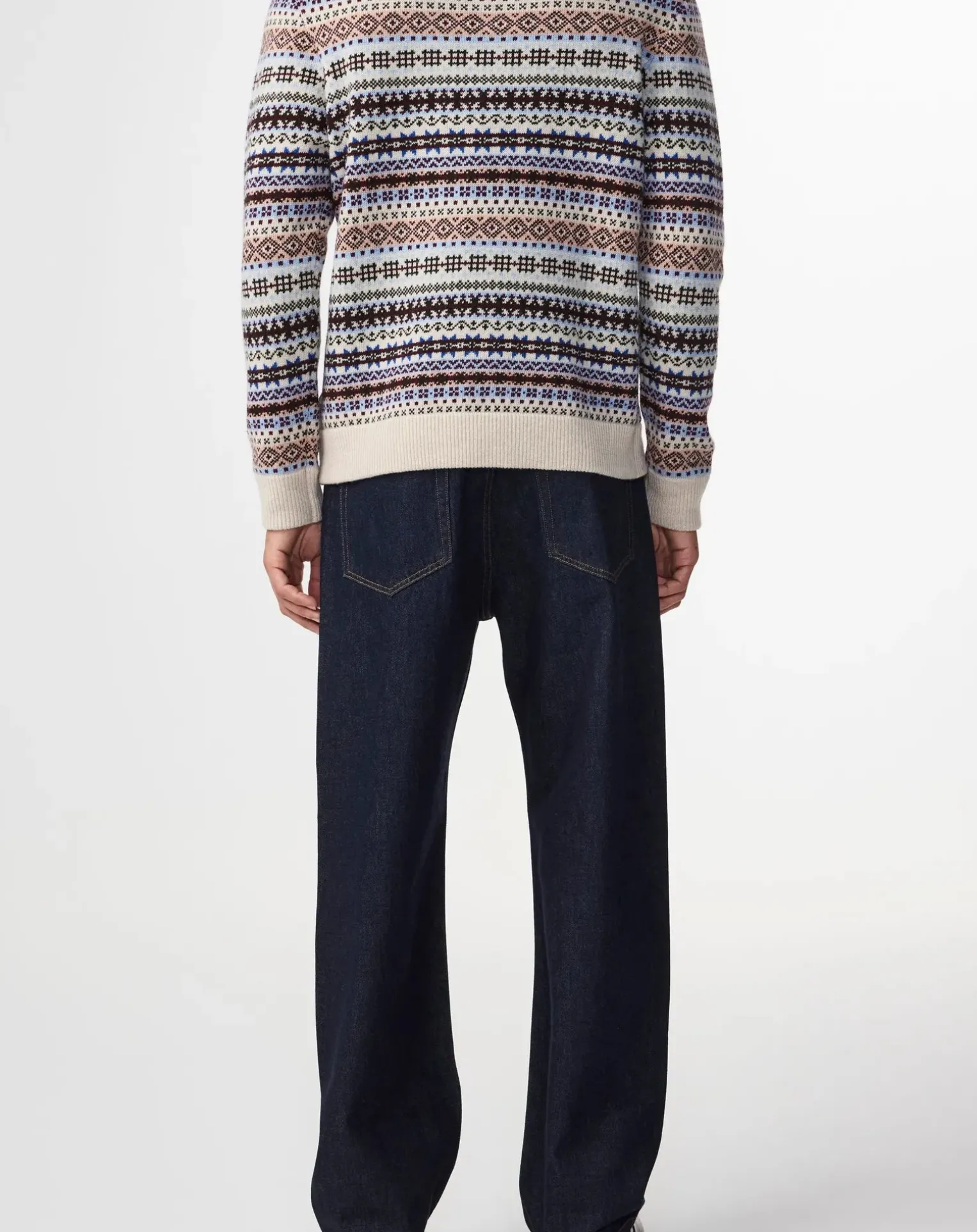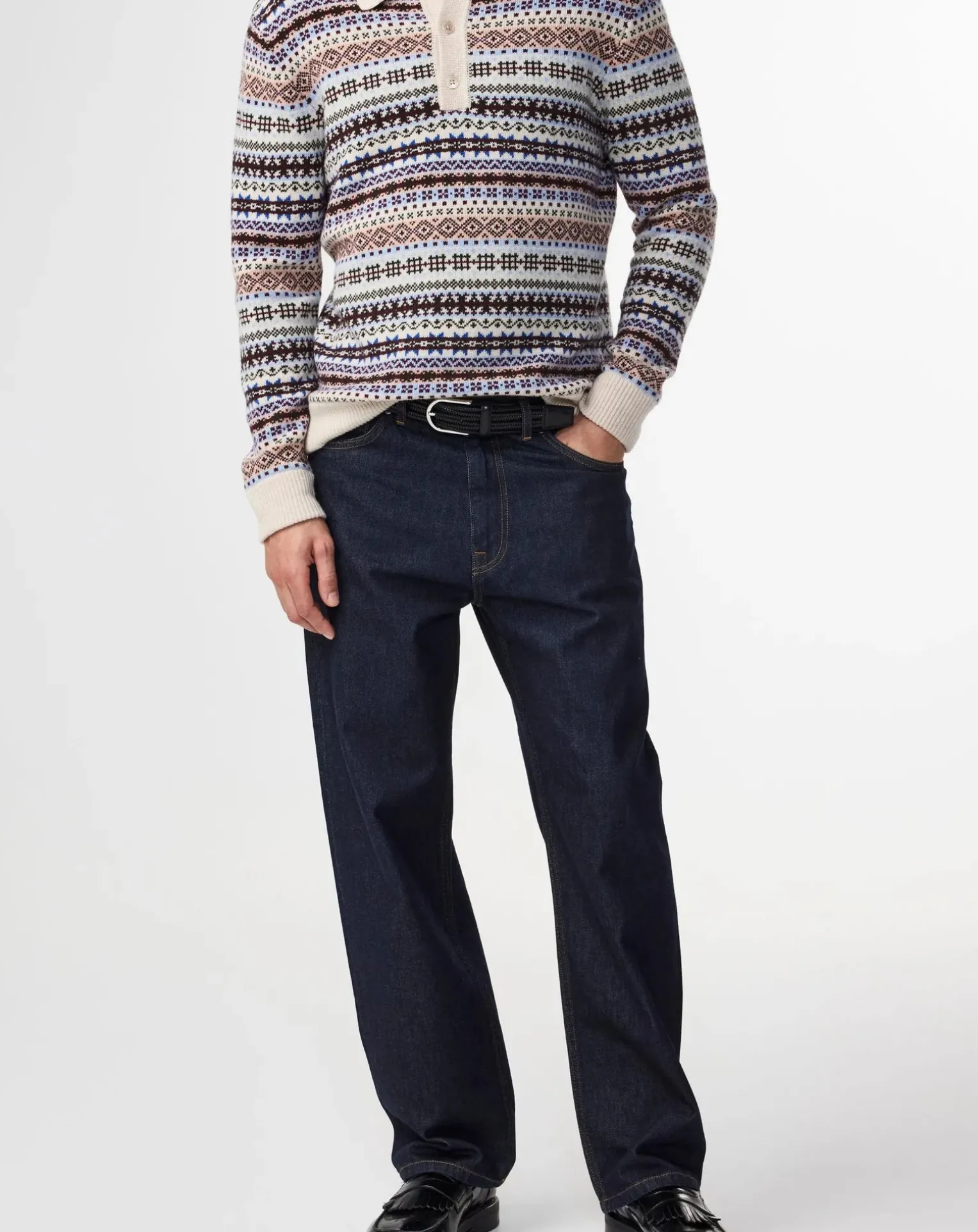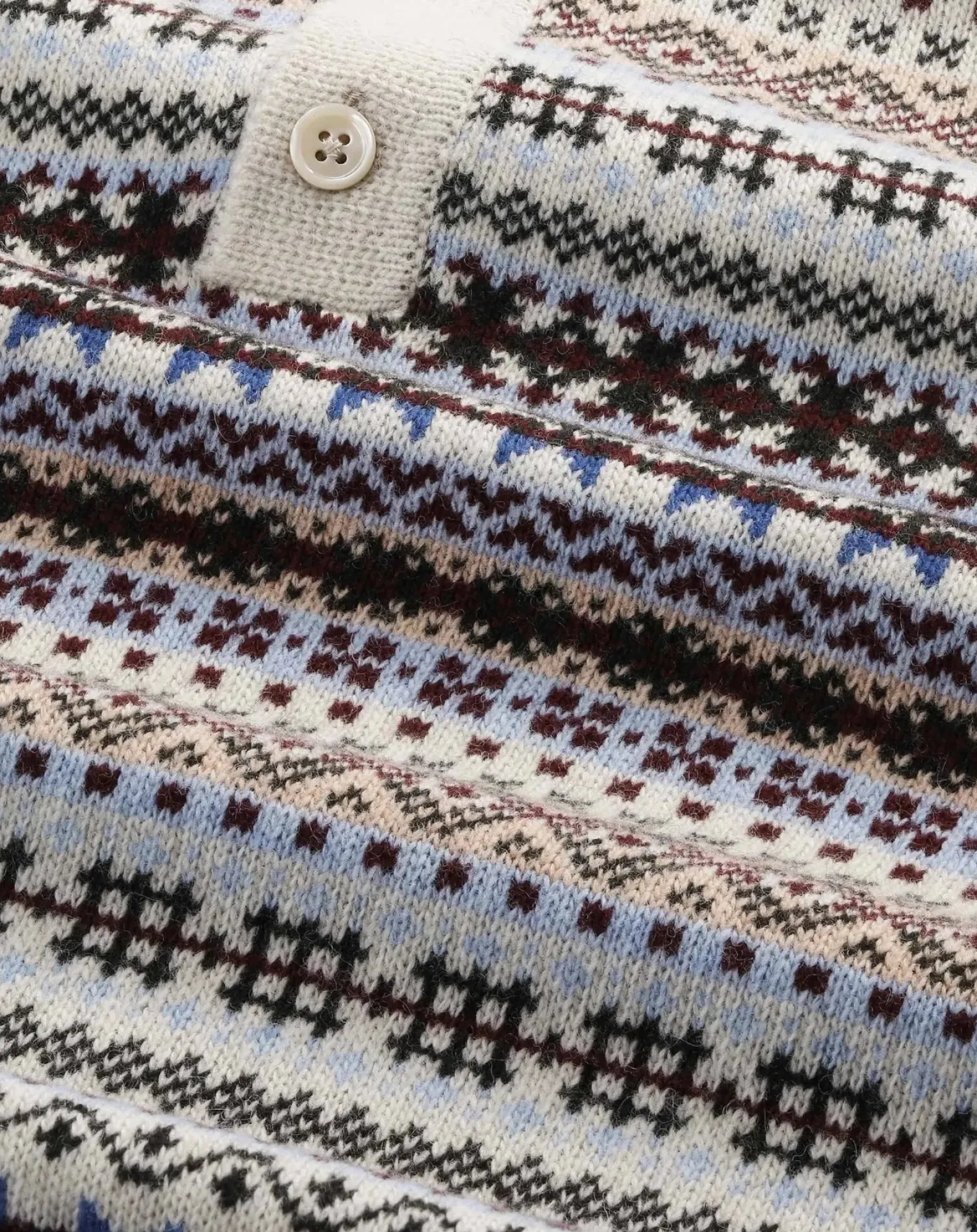 - Ce modèle est tricoté dans un motif Fair Isle coloré, avec une coupe ample et des boutons en coquille à la patte de boutonnage.