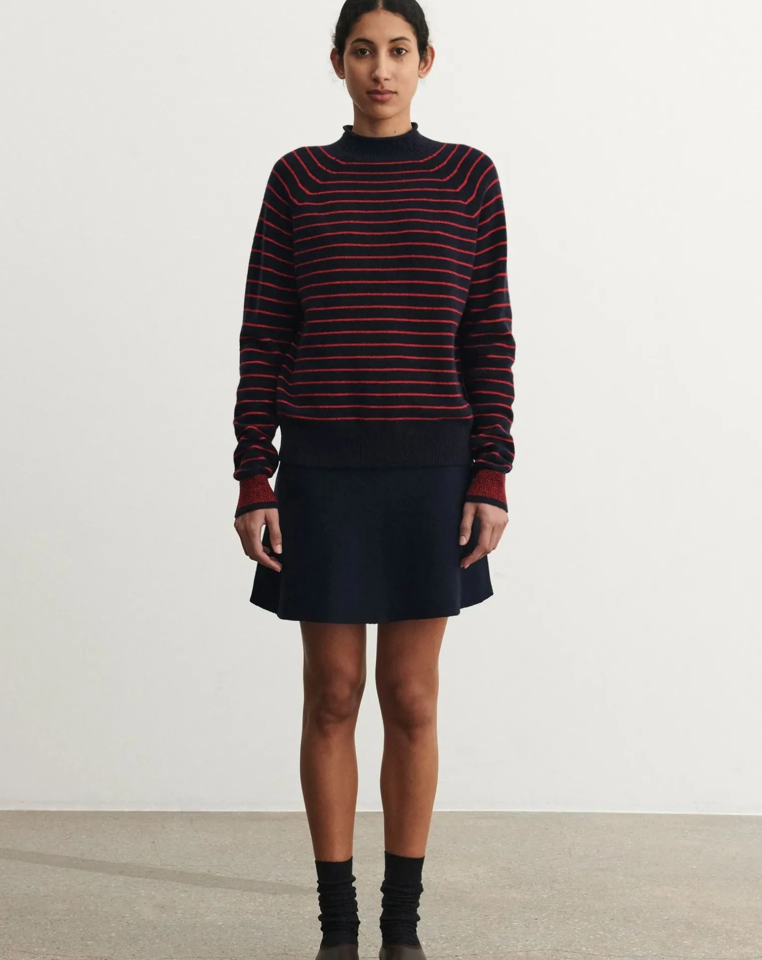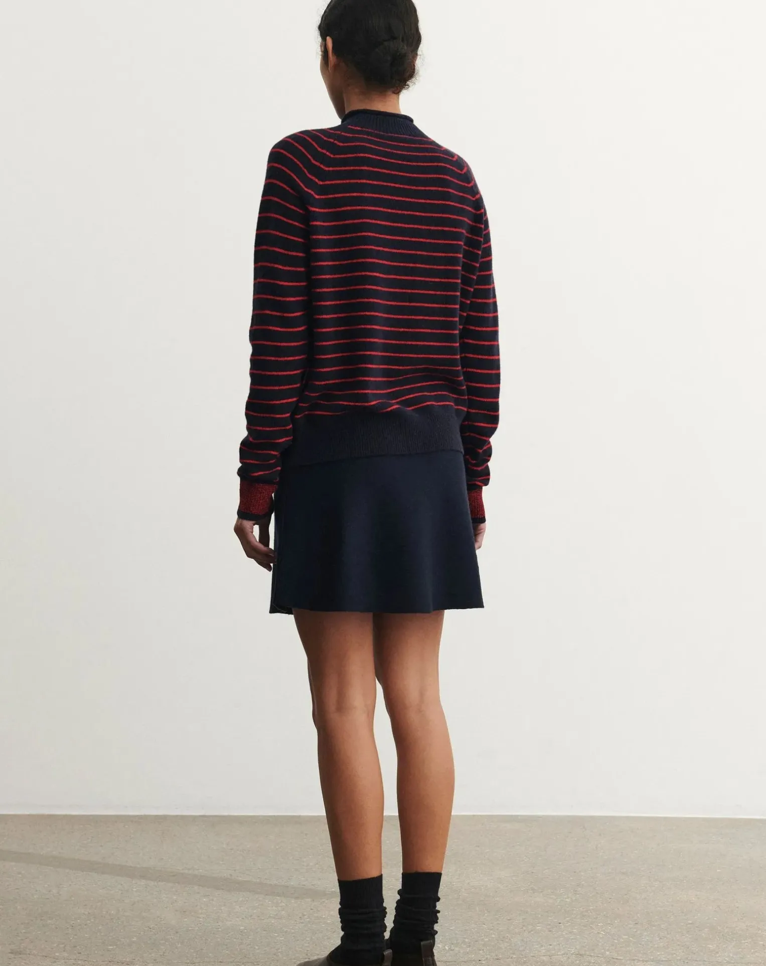 - Réalisée en laine mérinos extra-fine, cette jupe courte est dotée d’une large ceinture élastiquée qui assure un ajustement confortable. Cette jupe A-line est tricotée au point plein ferme, avec un aspect propre et minimal. La version Dark Navy est conçue avec un dos Dark Brown. Notre laine mérinos est certifiée BLUESIGN® et RWS, elle est exempte de produits chimiques nocifs et provient de moutons non mulets.