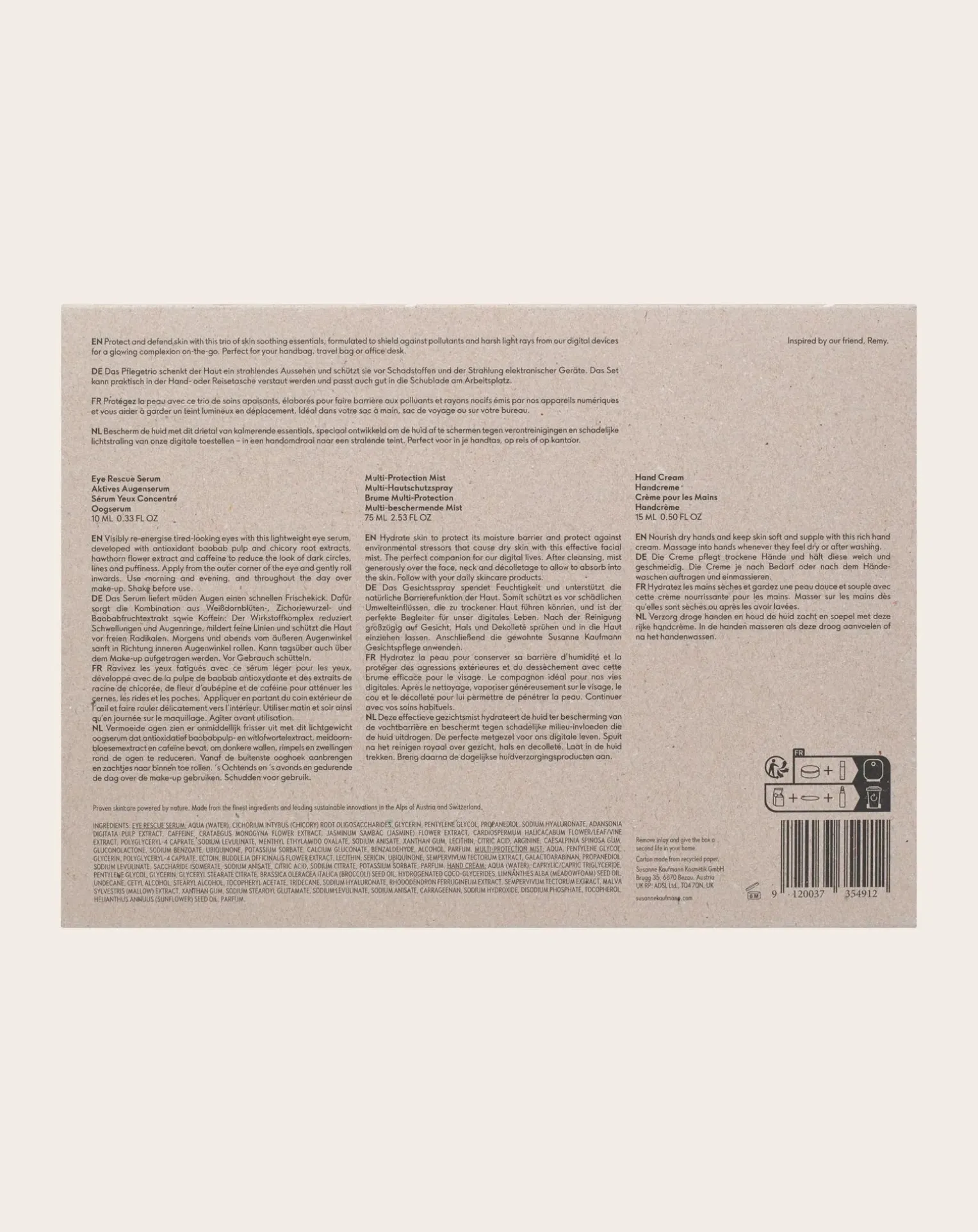 - Ce coffret continent trois produits : une Brume Multi-Protection taille réelle, un Sérum Yeux Concentré à l’acide hyaluronique, une Crème pour les Mains