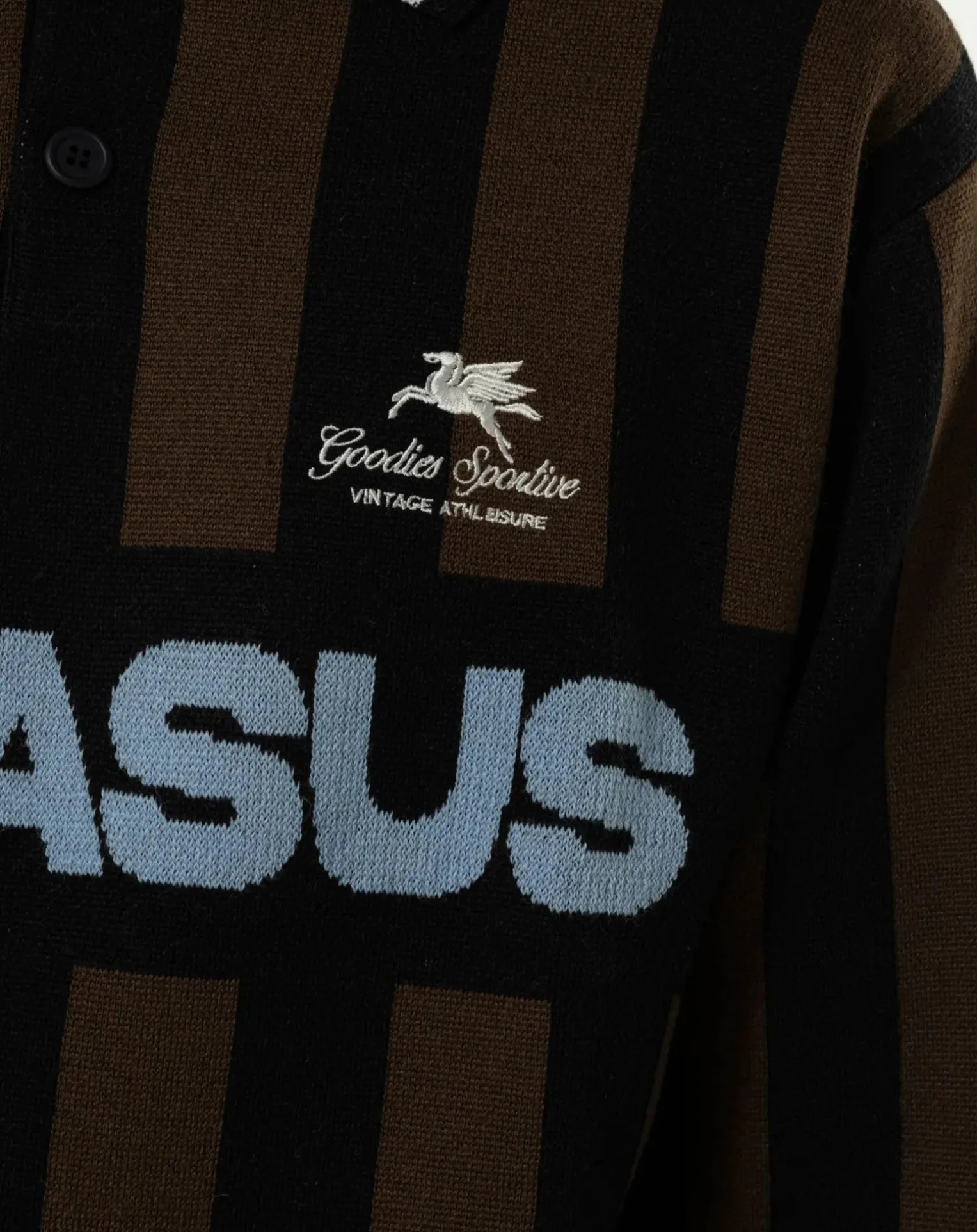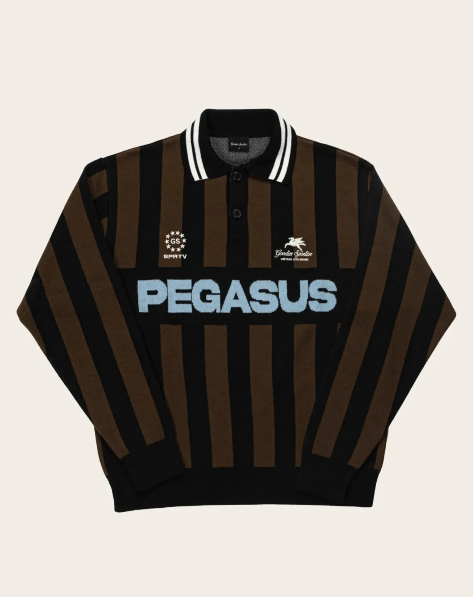 - Pull en maille fabriqué au Portugal. Col côtelé blanc, deux broderies blanches et imprimé Pegasus bleu.