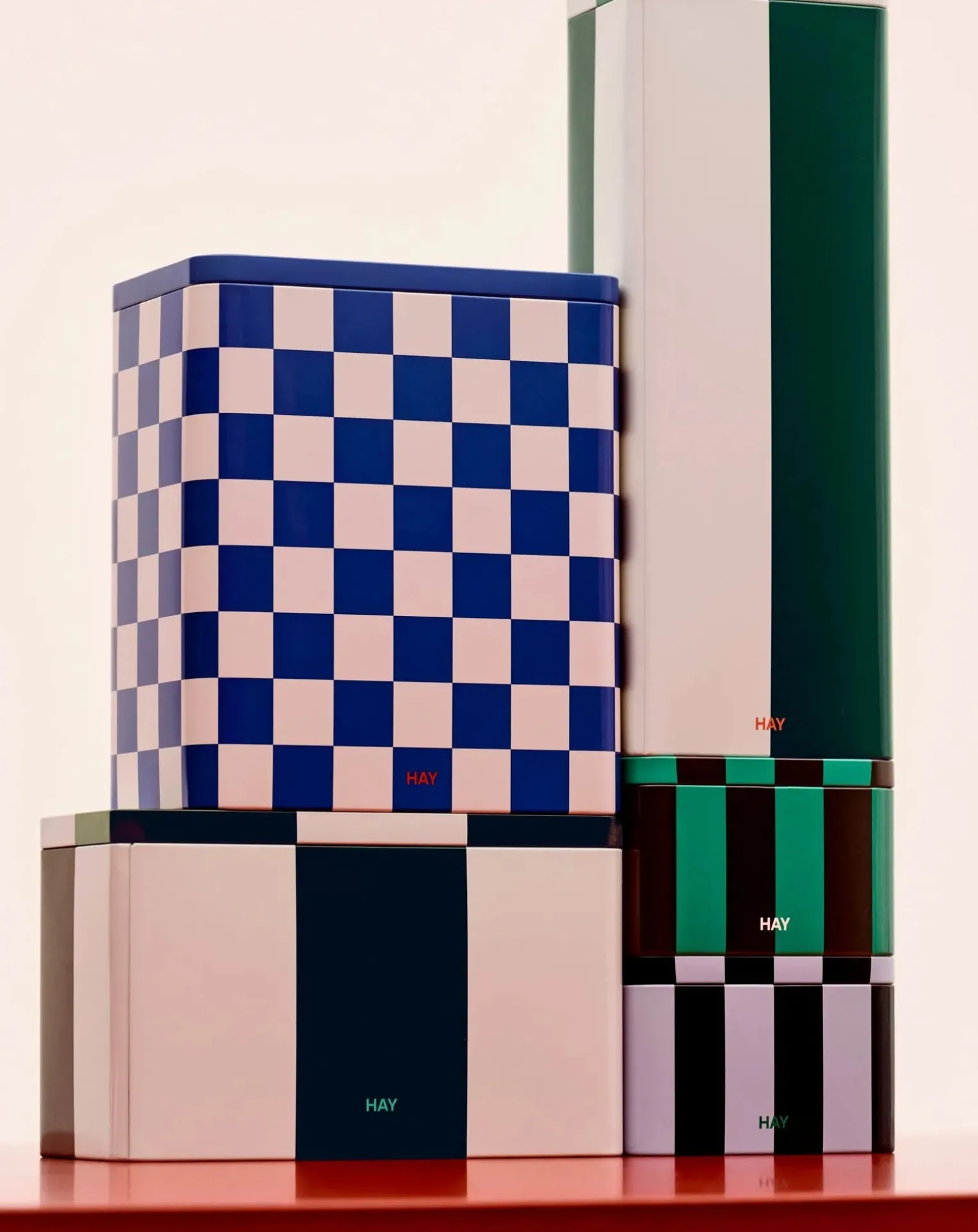 - Les Tin Containers de HAY sont une collection de boîtes de rangement fonctionnelles et décoratives, dotées de motifs à carreaux colorés et d’une finition brillante. Le couvercle et le récipient sont parfaitement alignés, ce qui donne un aspect élégant et homogène, tout en garantissant une fermeture hermétique adaptée à la conservation d’aliments secs. Disponibles dans un large assortiment de tailles, de formes et de motifs, les boîtes de conserve peuvent être placées de manière décorative sur des étagères ou des tables dans la maison pour ranger et organiser différents objets.