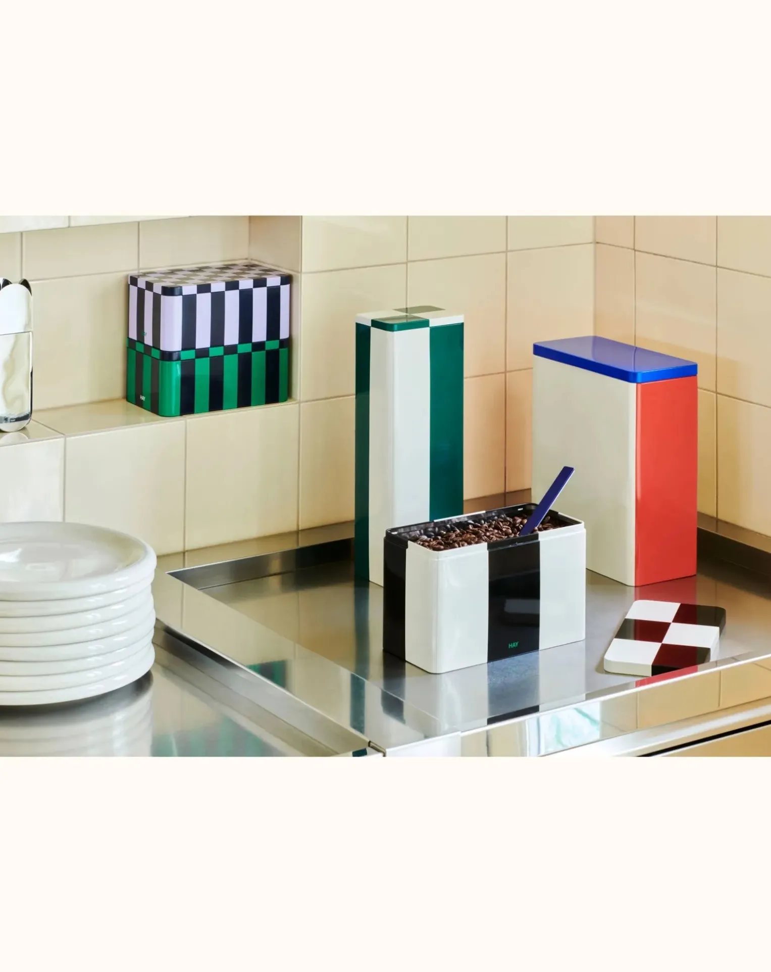 - Les Tin Containers de HAY sont une collection de boîtes de rangement fonctionnelles et décoratives, dotées de motifs à carreaux colorés et d’une finition brillante. Le couvercle et le récipient sont parfaitement alignés, ce qui donne un aspect élégant et homogène, tout en garantissant une fermeture hermétique adaptée à la conservation d’aliments secs. Disponibles dans un large assortiment de tailles, de formes et de motifs, les boîtes de conserve peuvent être placées de manière décorative sur des étagères ou des tables dans la maison pour ranger et organiser différents objets.