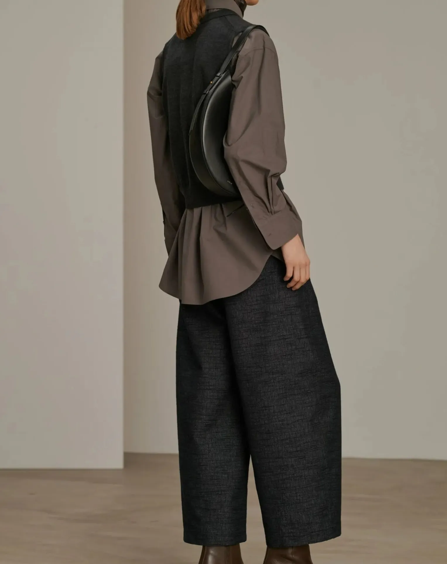 - Petit sac en cuir lisse noir porté épaule – Pochon en cuir d’agneau amovible à l’intérieur du sac et fixé par un bouton-pression – Doublure cuir d’agneau- Cuir LWG
