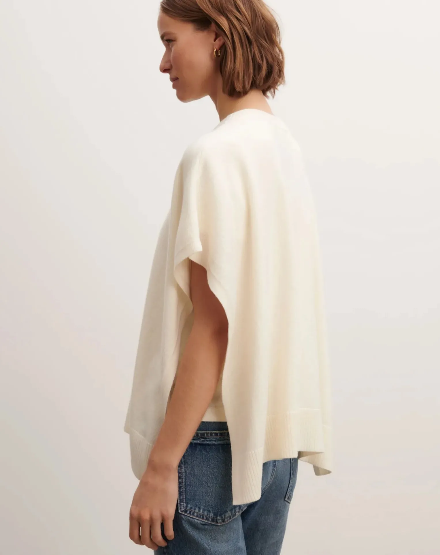- Poncho femme en cachemire. Modèle à col bateau avec finitions côtelées sur l’encolure et les bords.