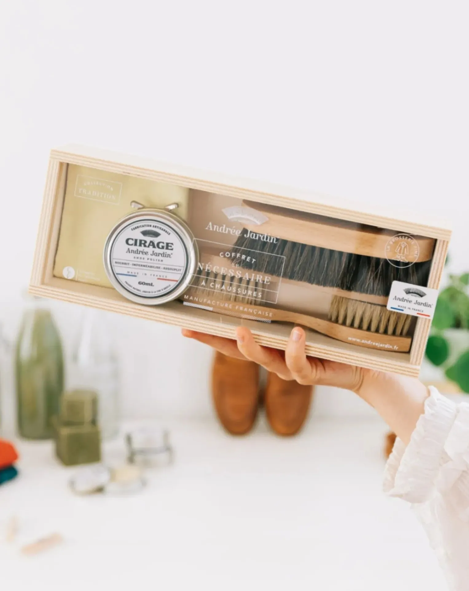 - Ce coffret contient : 1 brosse à reluire, 2 brosses à cirer , 1 chamoisine , 1 cirage incolore