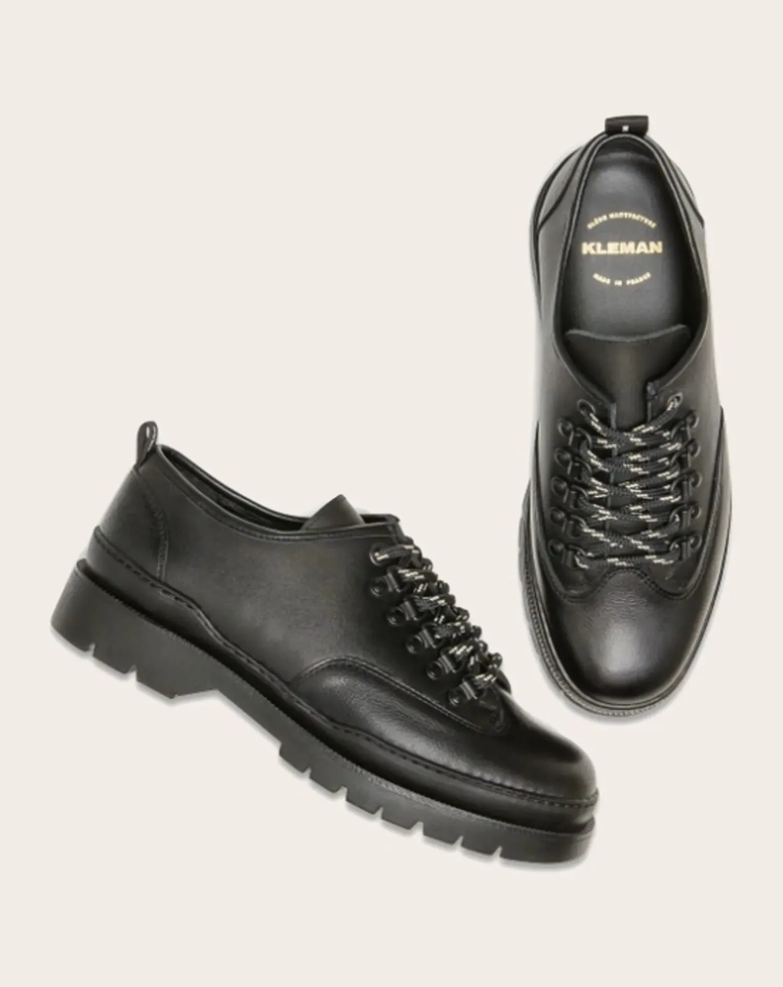 dessus cuir – doublure cuir + textile – première cuir – semelle caoutchouc