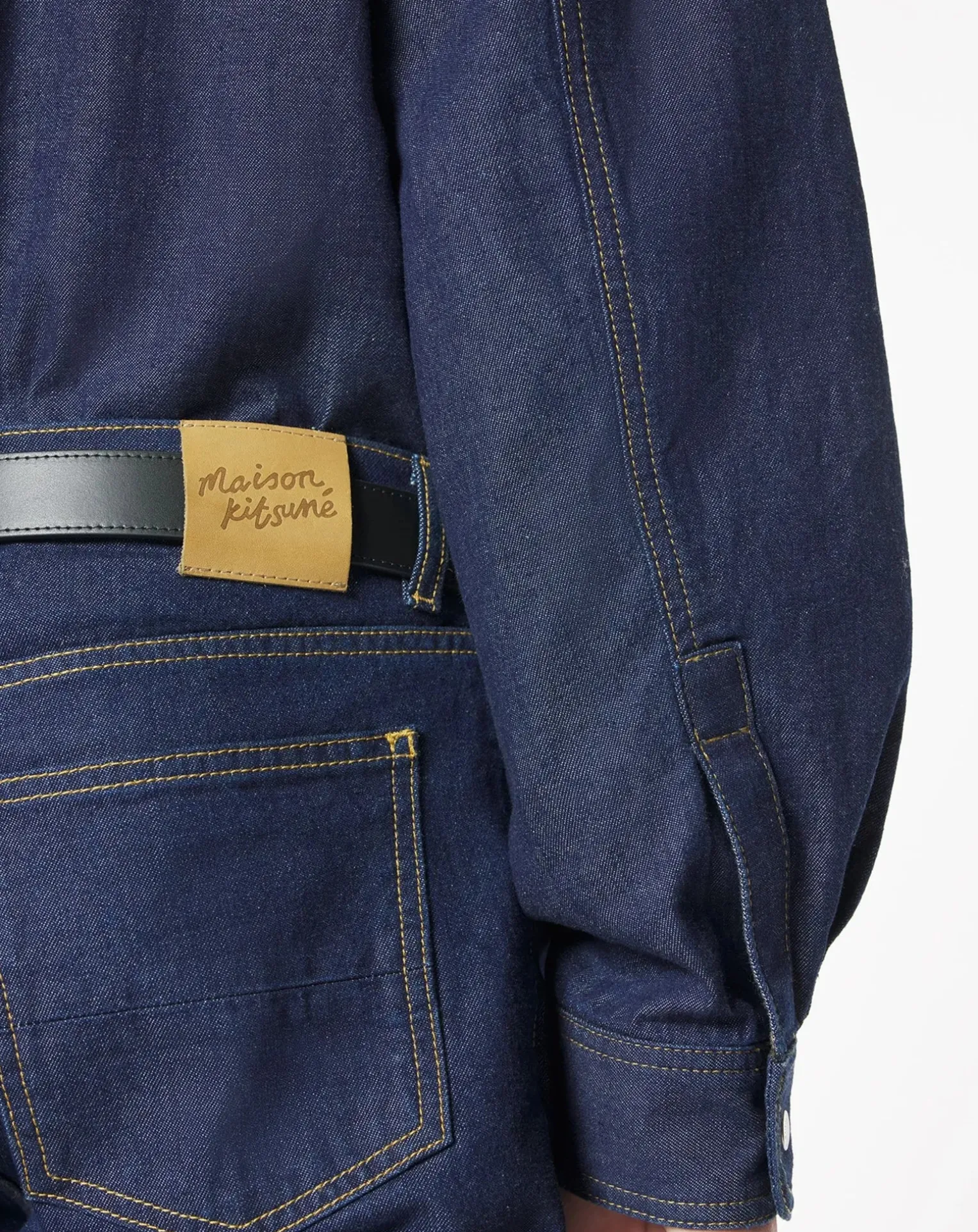 - Pantalon à ceinture montée avec passants, fermeture boutonnée en métal gravé Maison Kitsuné et braguette boutonnée sous patte, cinq poches, et jacron en cuir embossé de la signature Maison Kitsuné Handwriting au dos.