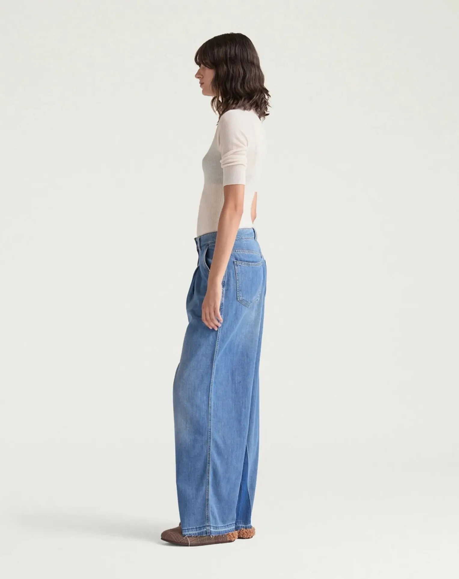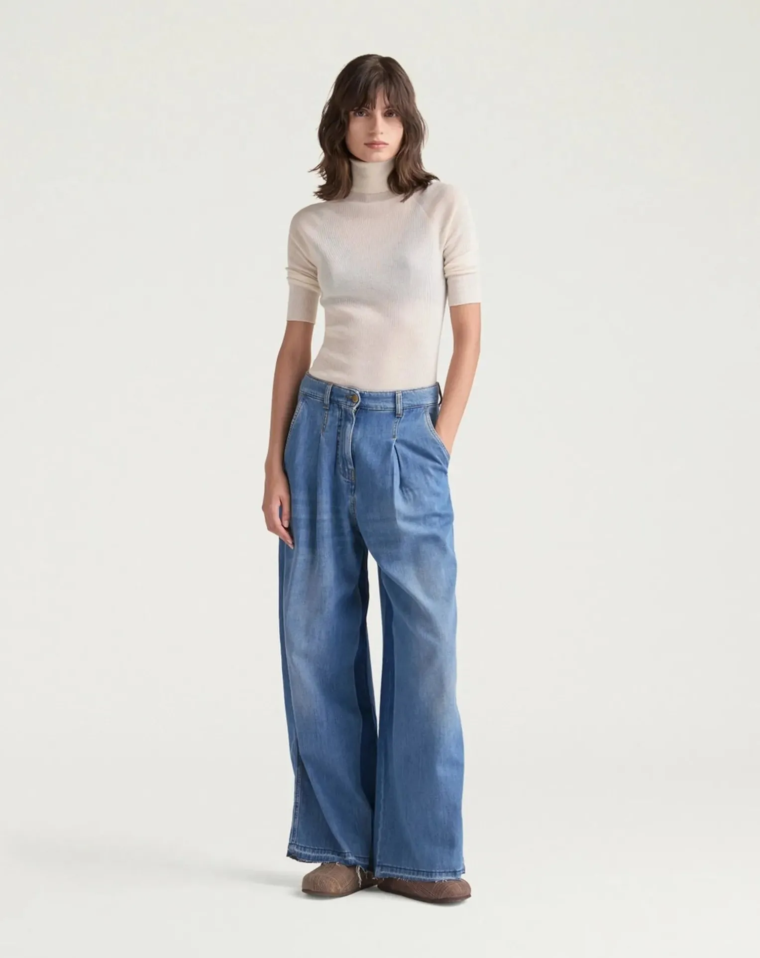 - Pantalon over avec cut homme avec pinces en denim indigo. Ligne de couture traduite en denim et rendue unique par l’utilisation des réserves de couleur contrastée à l’intérieur et au bas de la jambe découpée. Les détails sont le passe-partout Momoni, la peau en cuir personnalisé, cocuture de tabac et de la métallurgie de canon de fusil.