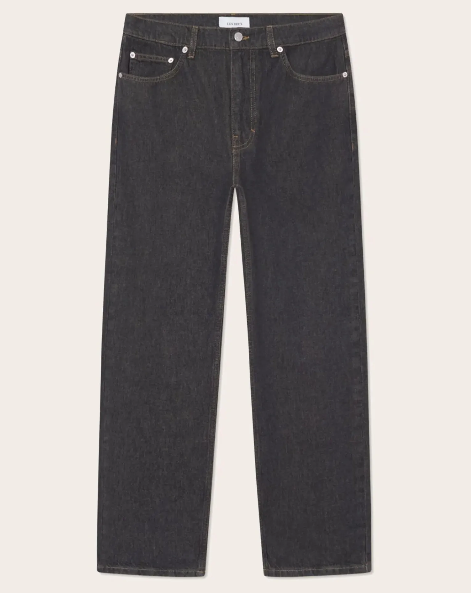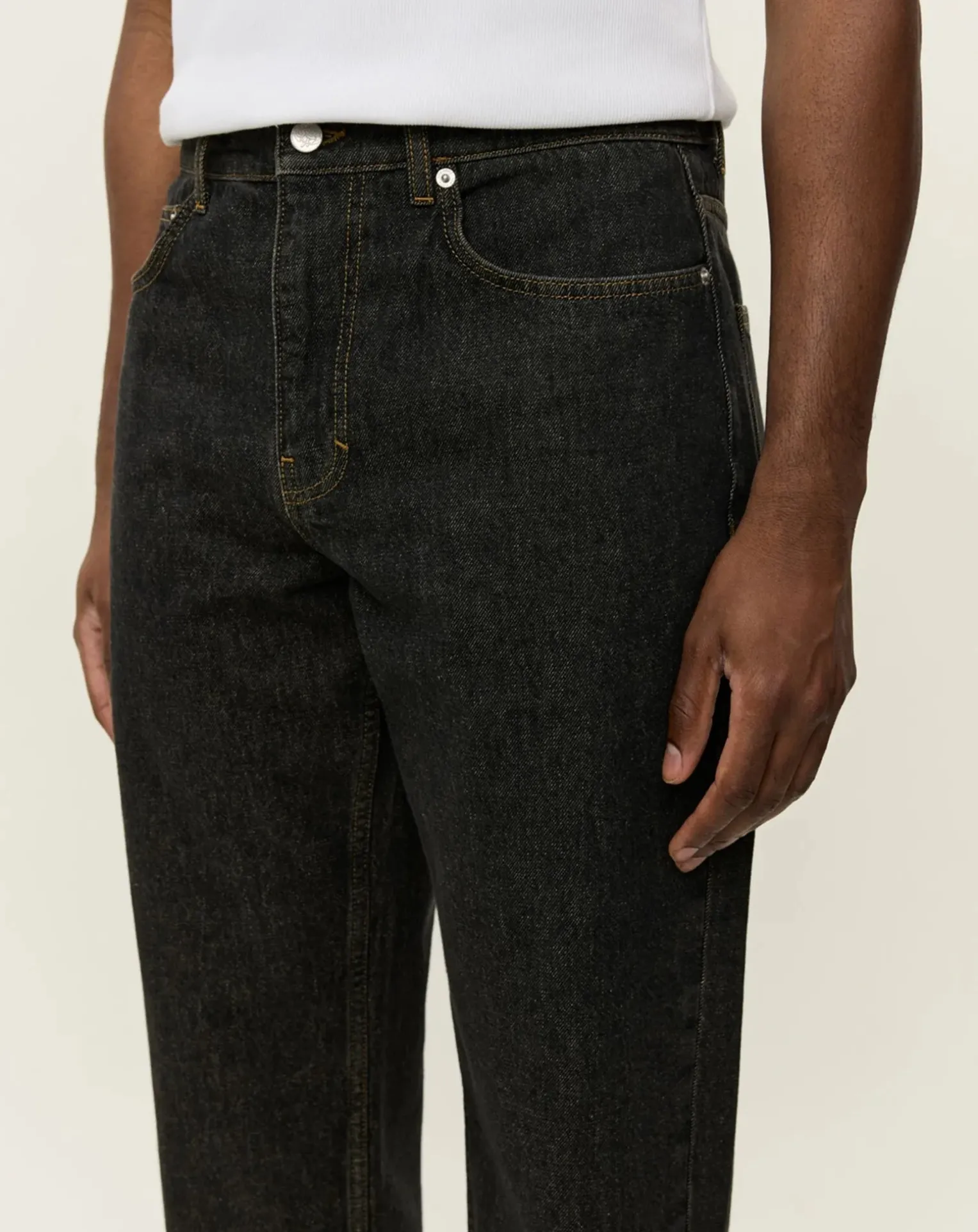 - Denim épais Finition bicolore 5 poches avec poche à monnaie Détails de style selvedge Braguette à glissière avec accessoires de marque Coupe fuselée