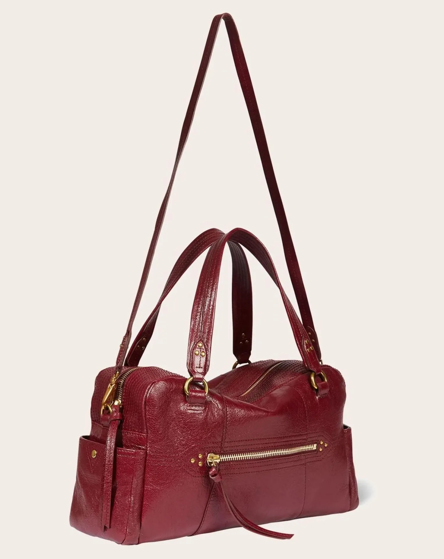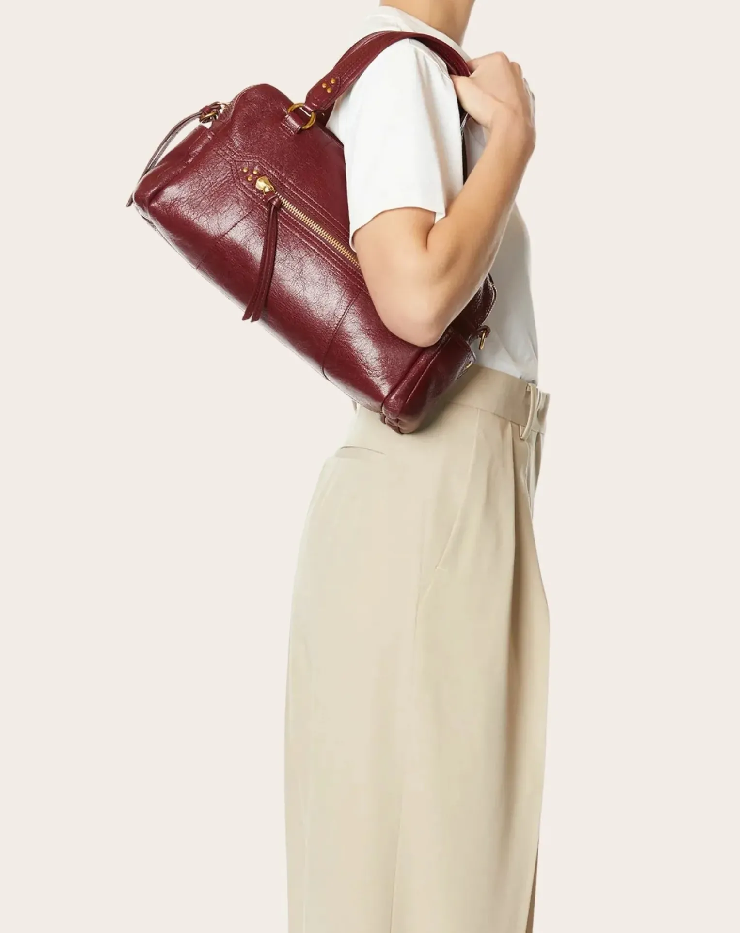 - Sac bowling porté épaule, croisé ou à la main. Bandoulière amovible, fermeture zippée avec des liens en cuir.