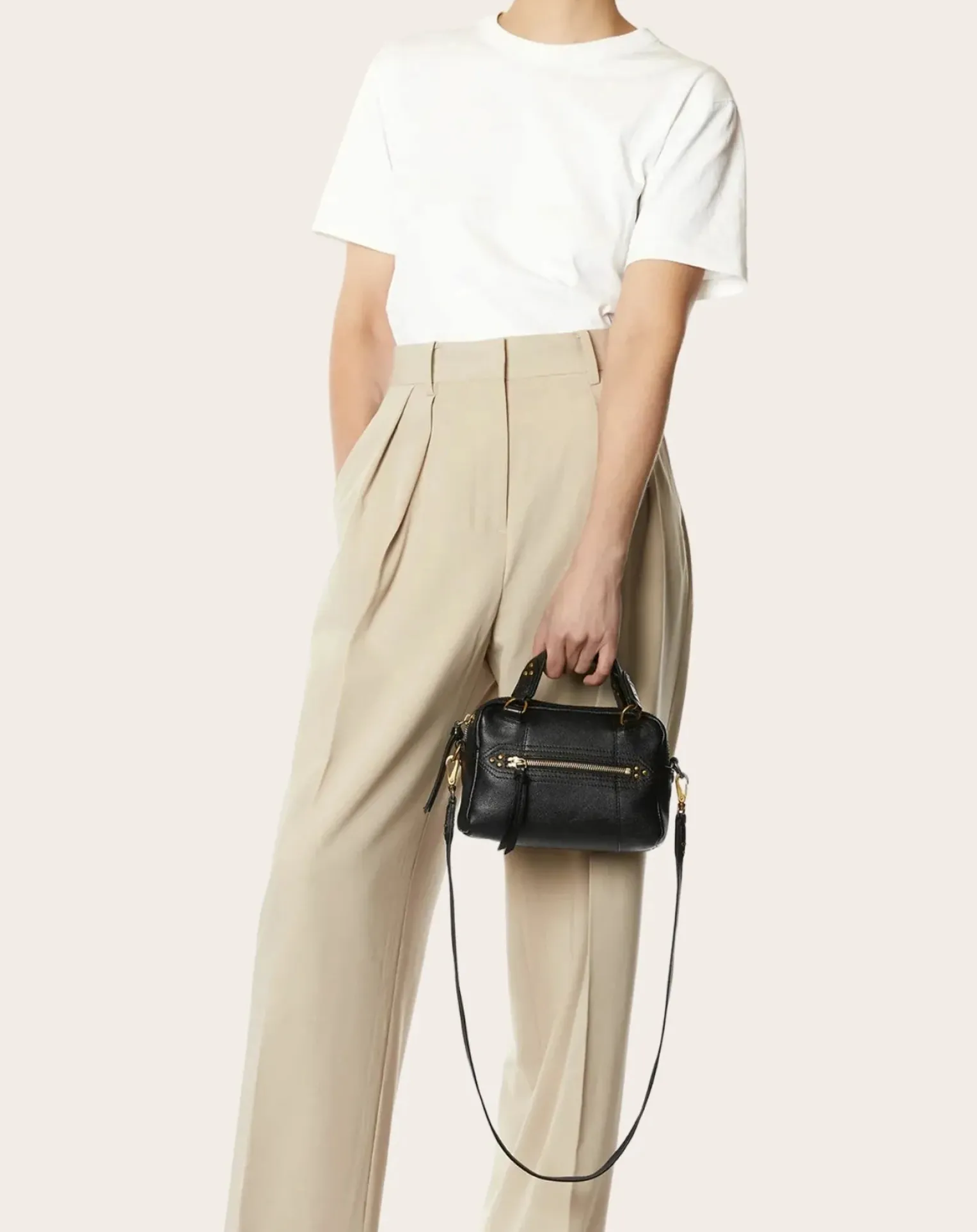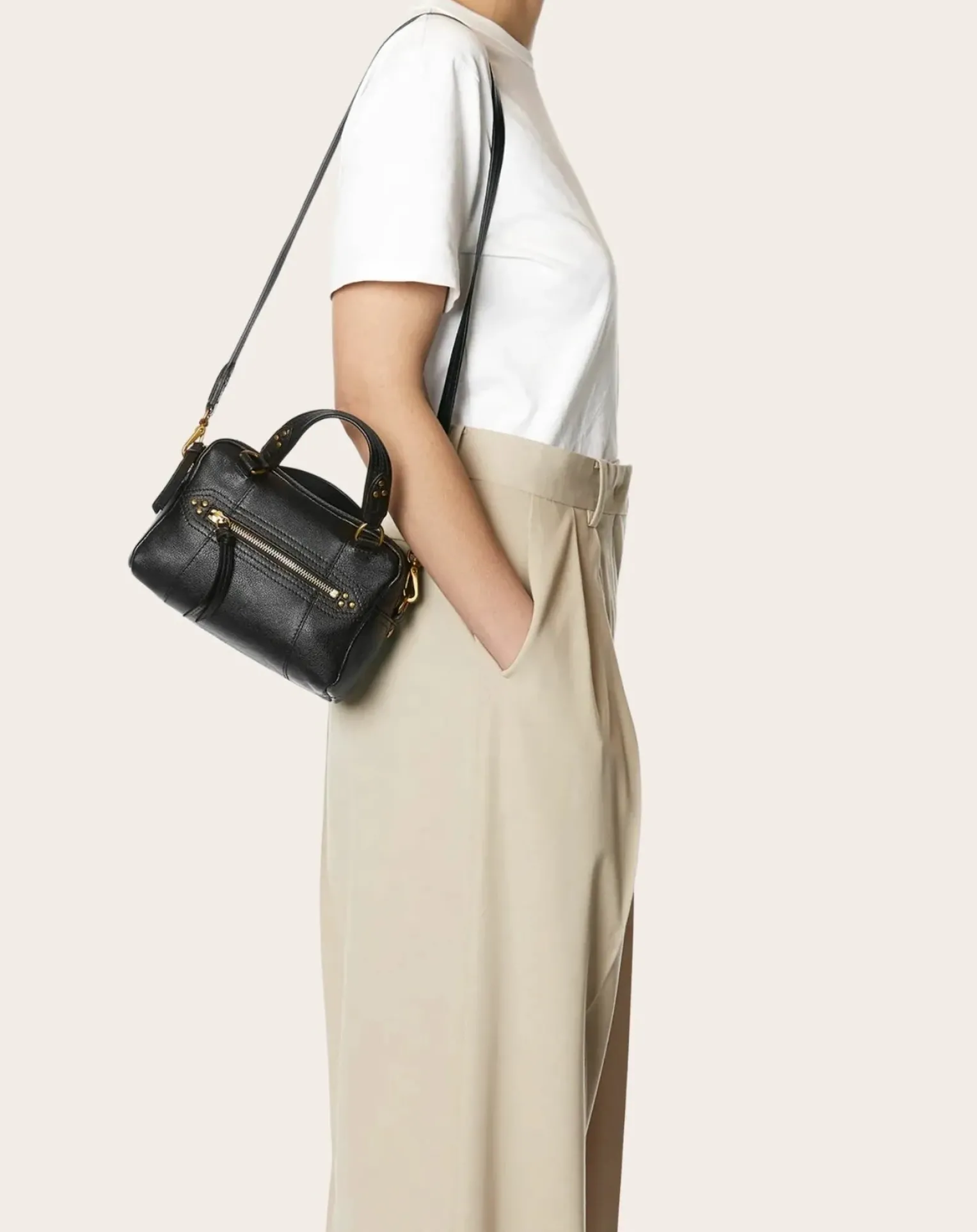 - Sac bowling porté croisé ou à la main. Bandoulière amovible, fermeture zippée avec des liens en cuir.