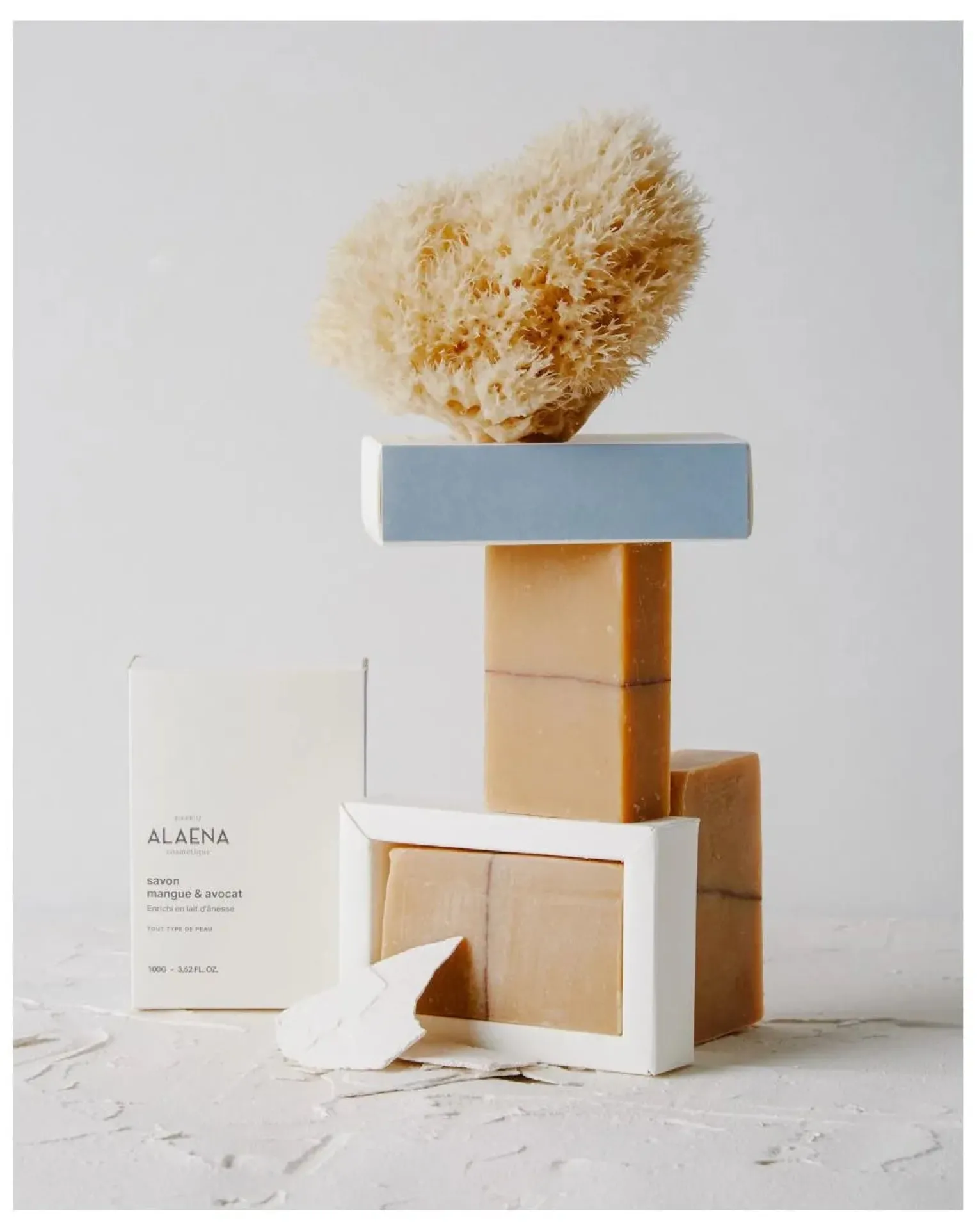Le savon Mangue/Avocat d’Alaena est un savon solide pour tous les types de peaux.