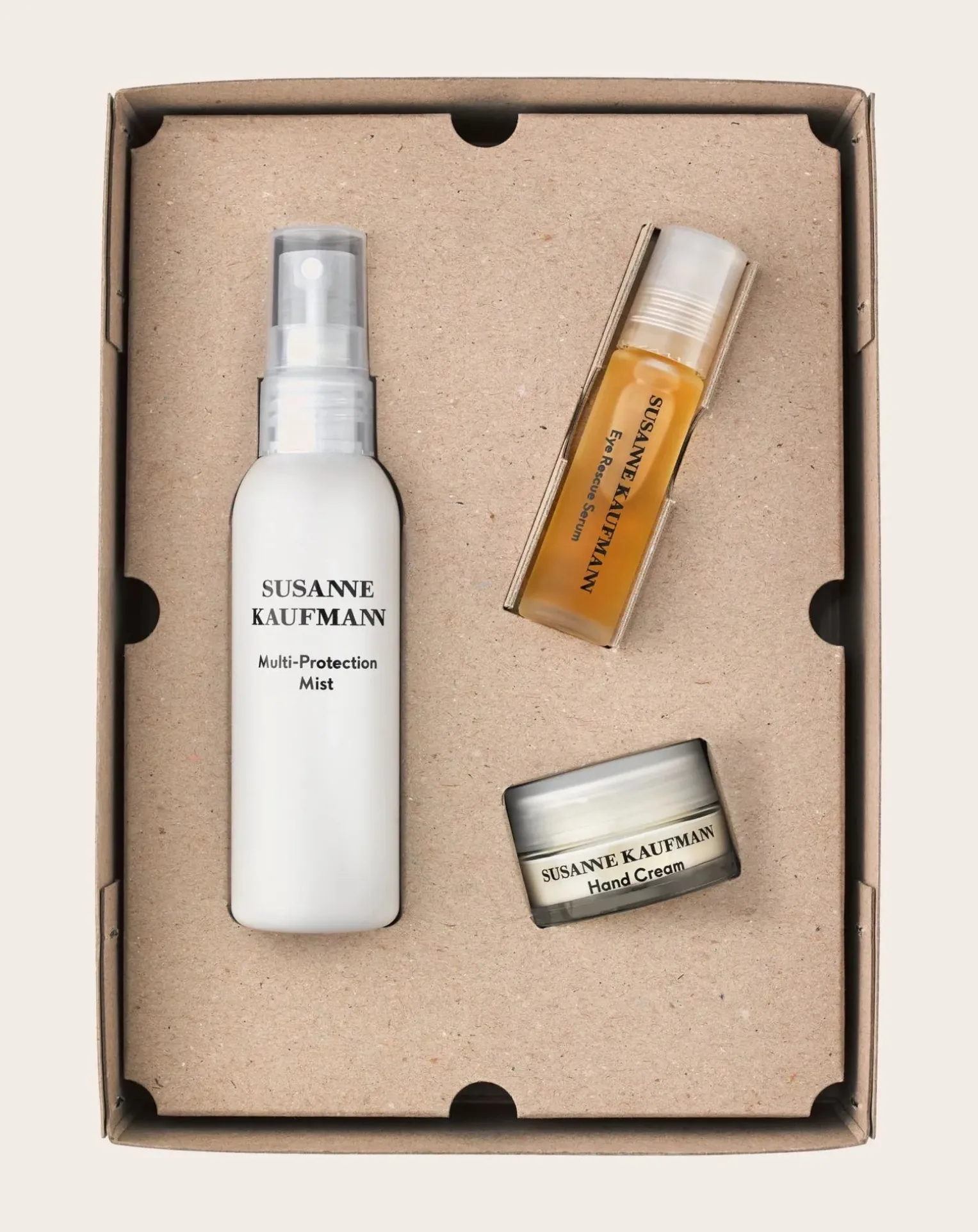 - Ce coffret continent trois produits : une Brume Multi-Protection taille réelle, un Sérum Yeux Concentré à l’acide hyaluronique, une Crème pour les Mains