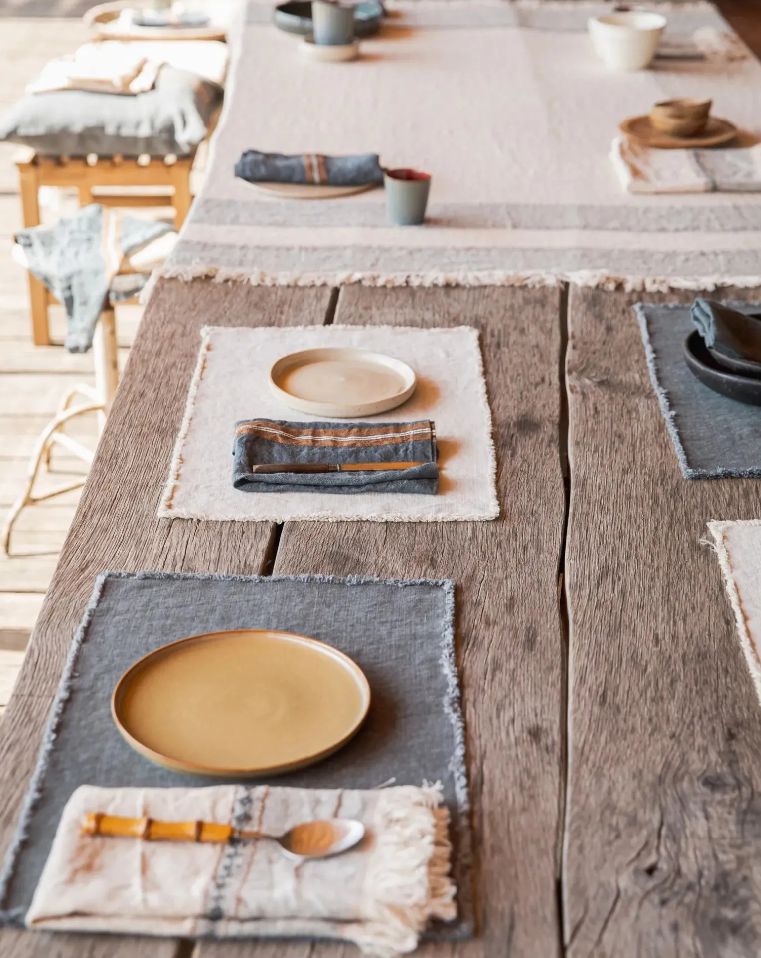 Inspiré par la côte de la Californie, ce napperon est idéal pour tous les jours ou pour des occasions spéciales, c’est une collection polyvalente. Le tissu robuste enrichi avec des couleurs de lin deviendra plus patiné après lavage. Finition à franges, car les franges sont plus amusantes!