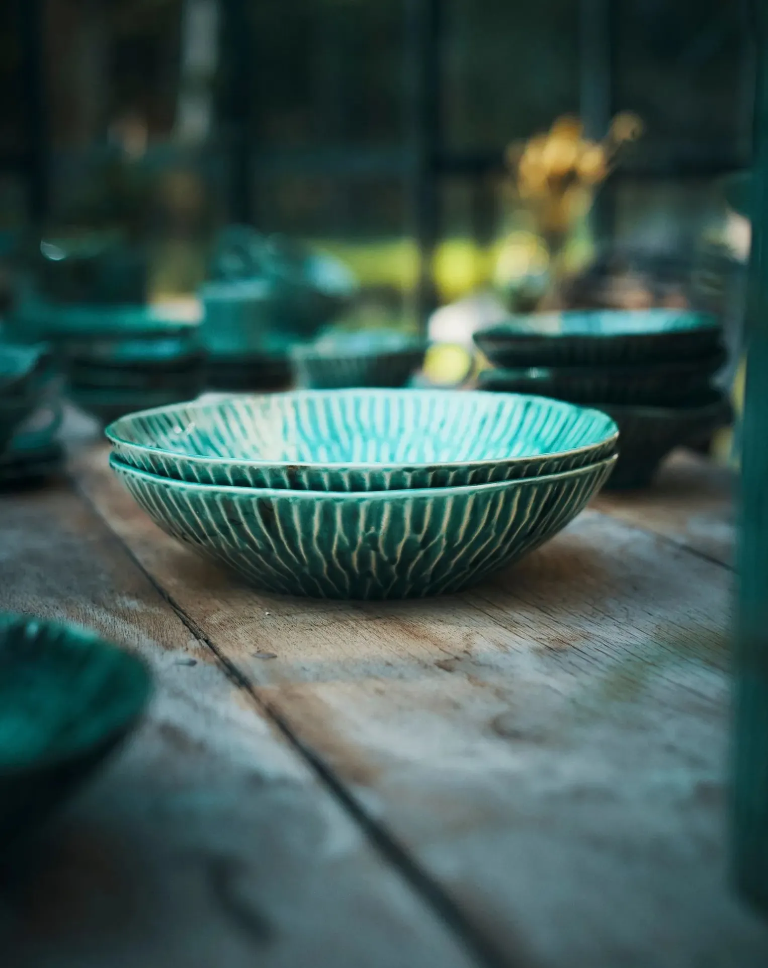 - Pour son dernier livre « Eén Pan », Naessens n’a pas seulement pris la plume, elle est aussi retournée dans son atelier de céramique. Elle a personnellement créé la collection « Verde Lanza », désormais produite en exclusivité par Serax. Le nom fait référence à l’île de Lanzarote, où Naessens réside souvent. Elle s’y est inspirée du vert des fenêtres et des portes en bois, ainsi que des rares plantes qui se détachent sur le paysage lunaire noir. Le vert délavé par le soleil – une teinte qui se marie à merveille avec tout ce qui est délicieux – est rehaussé par la texture en forme de coquillage que Naessens a appliquée avec ses doigts. En bref : cent pour cent Pascale et autant de soleil.