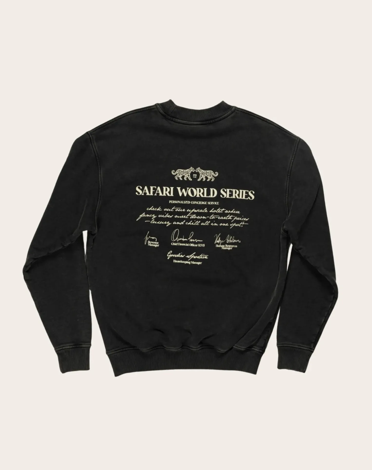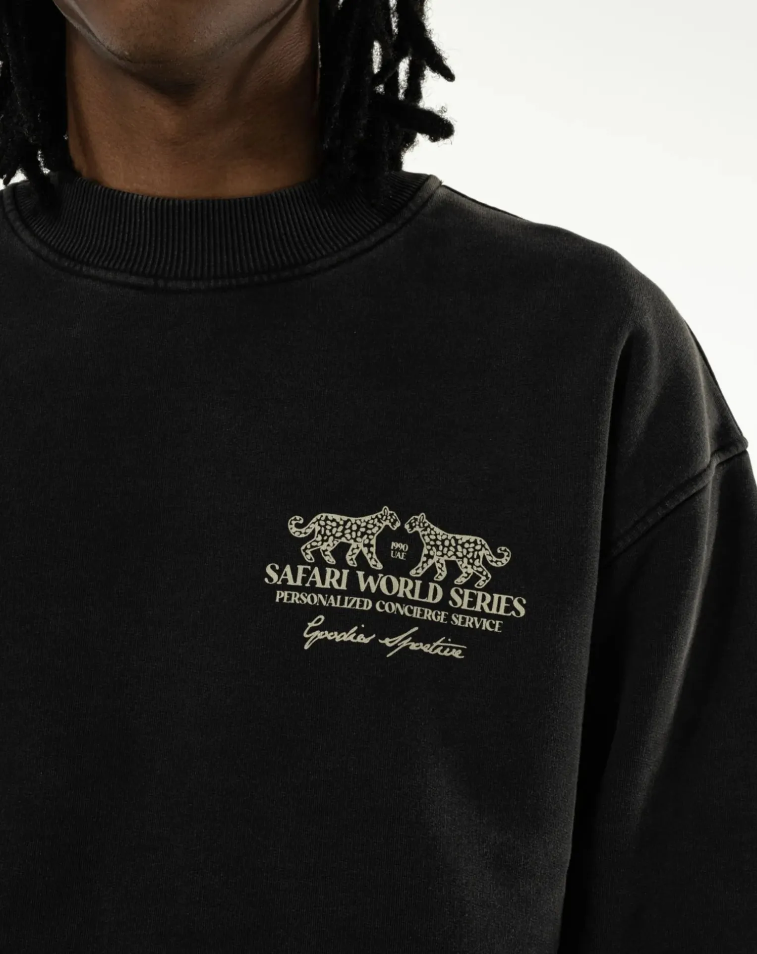 - Sweat col rond noir effet stone wash, coupe carrée. Logo à l’avant et à l’arrière, col rond.