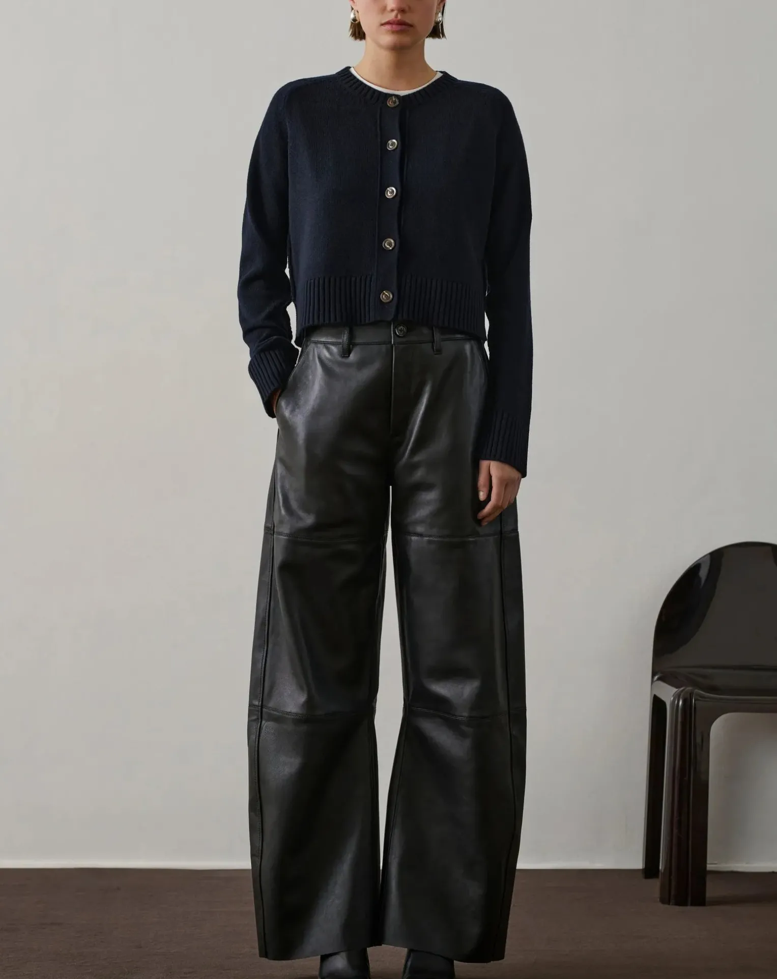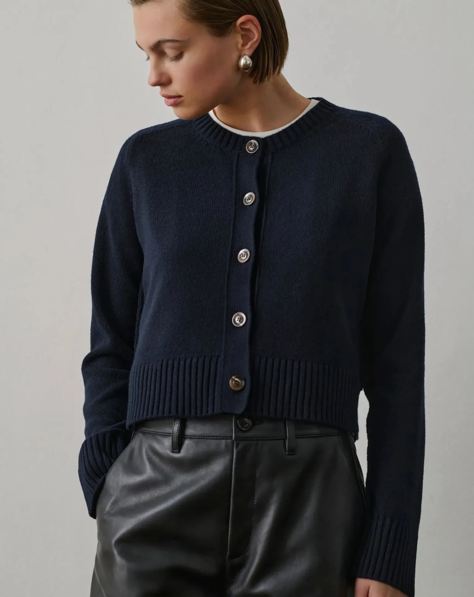- – Cardigan court en laine mérinos- Coupe courte- Manches longues- Encolure ronde- Ouverture boutonnée devant- Détails coutures aux épaules- Laine mérinos